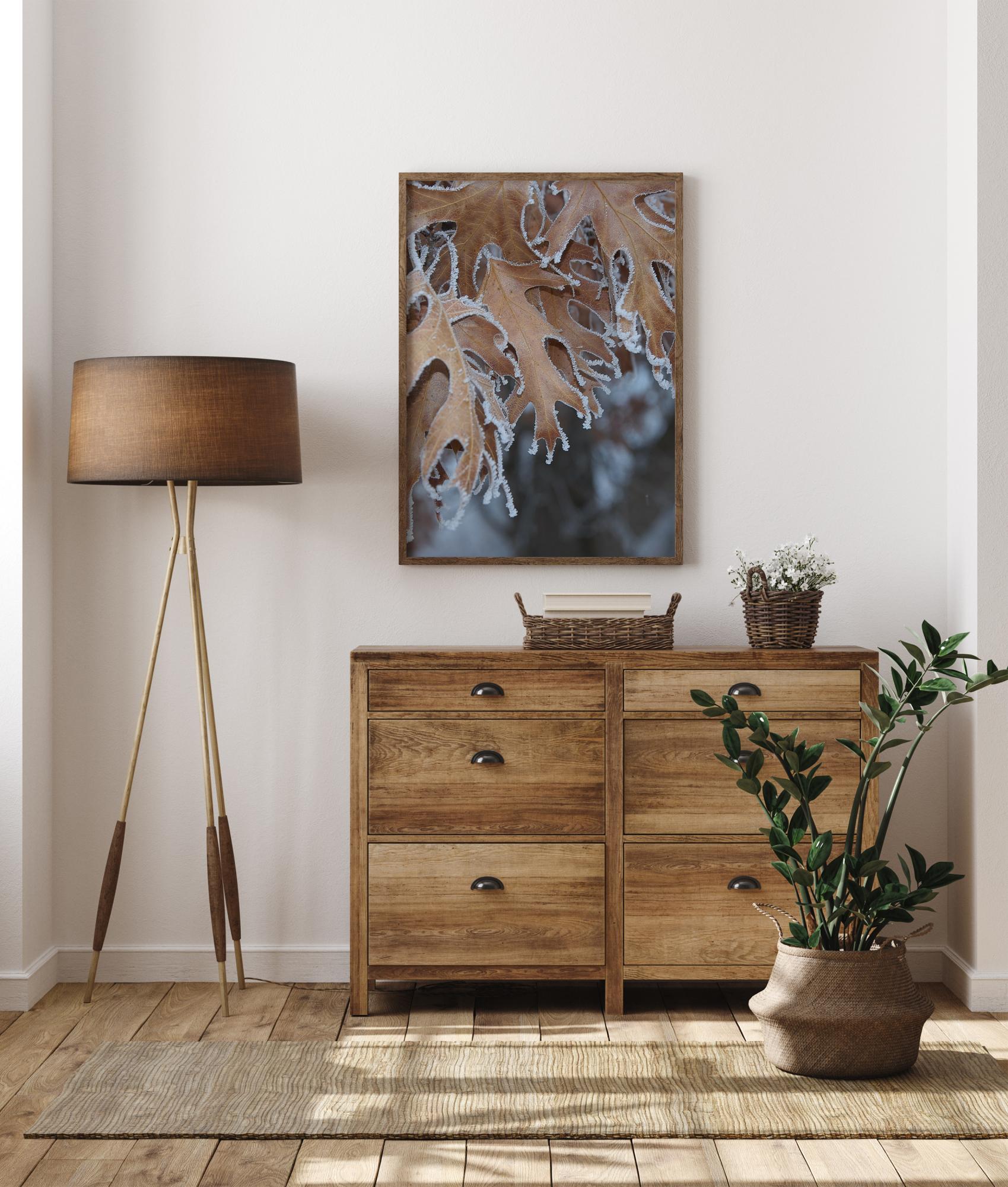 Uma foto macro de folhas de outono, cercadas por geada. As folhas marrons e secas se enrolam no frio, cada uma com uma borda de geada de pequenas partículas de gelo que criam uma espécie de decoração. Sinta o frio quando pendurar esta foto.