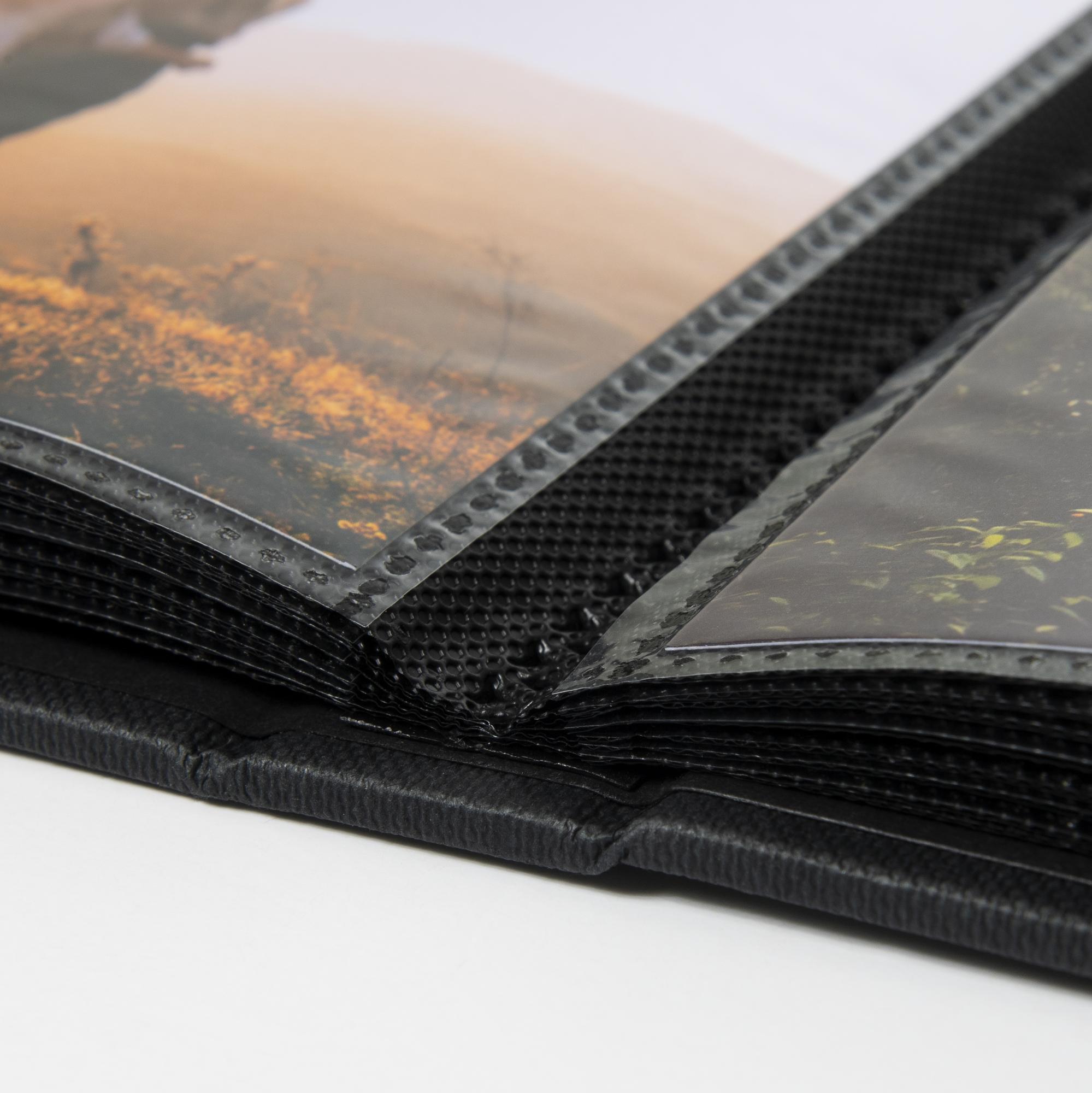 O álbum possui páginas pretas feitas de papel livre de ácido. As fotos são colocadas em bolsas fotográficos práticos.