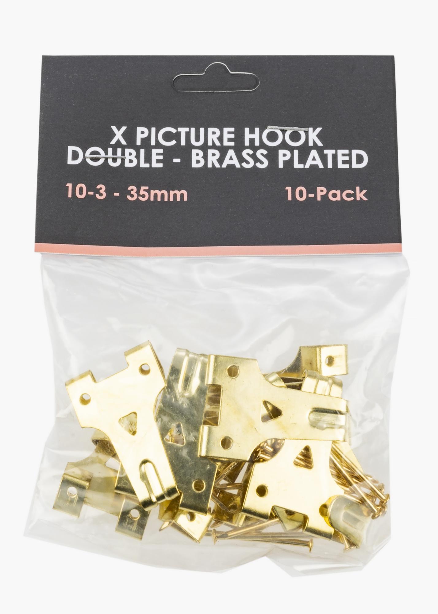 Gancho duplo X para montagem em parede de madeira ou gesso. Suporta uma carga de até 10 kg. Cor latão.