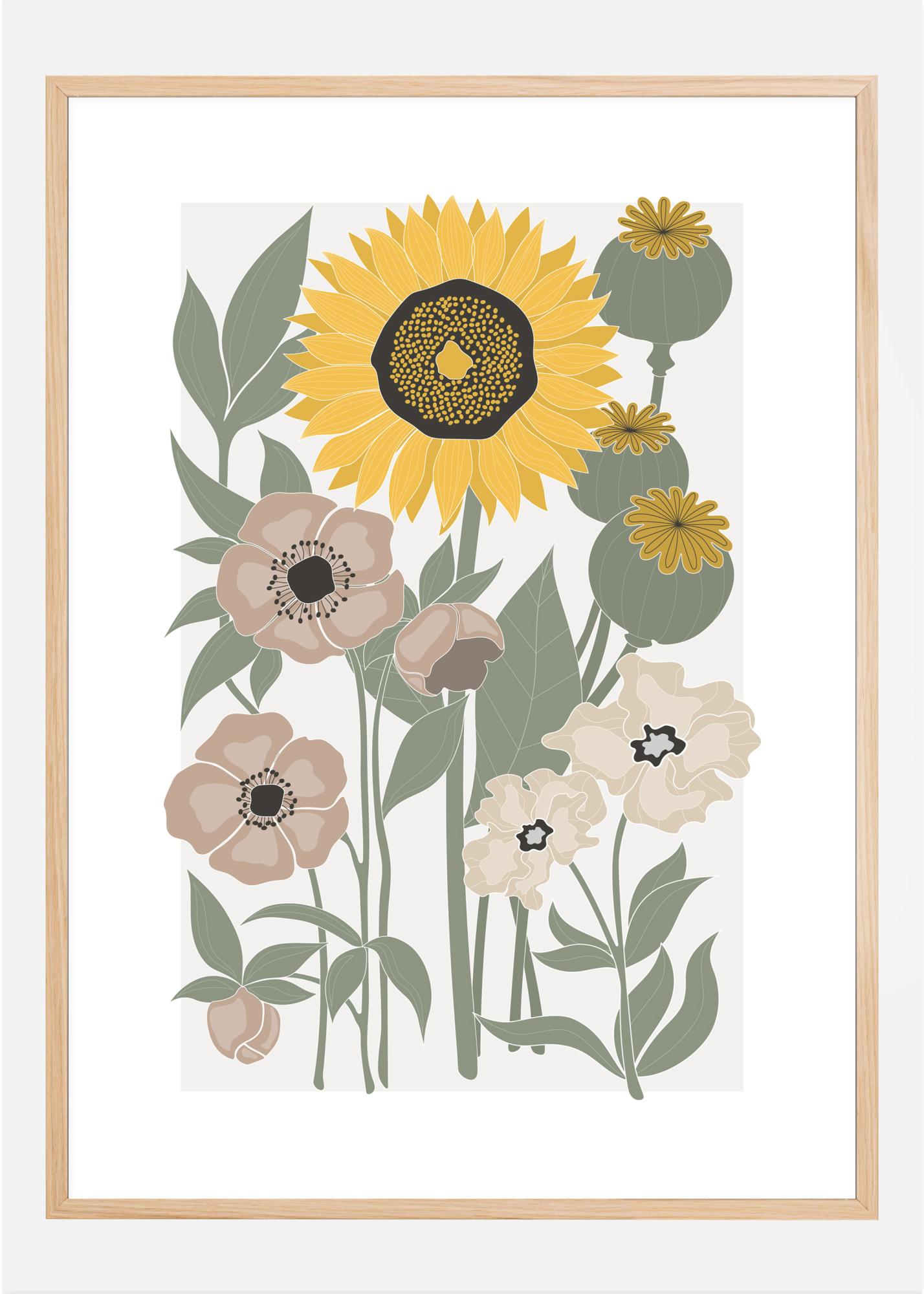 Um póster a suave com diferentes flores. Um girassol claro domina o centro da imagem junto com outras flores como papoula neste póster de jardim. O estilo simples facilita a visualização dos detalhes e apreciação desta imagem ensolarada.