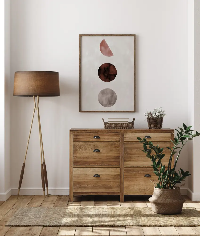 Um póster geométrico com dois círculos e um semicírculo num fundo branco. O círculo inferior é verde, o do meio é marrom e o semicírculo no topo é rosa e está de lado. Pendure este design abstrato simples, mas atraente, numa parede comum para dar a ela uma sensação de estilo e classe.