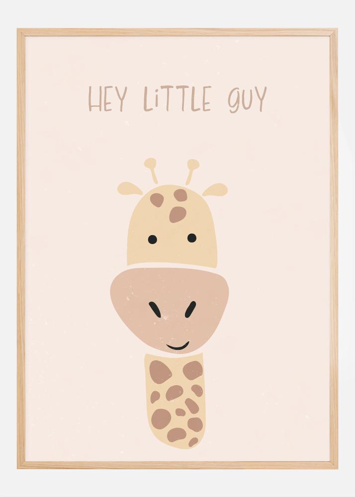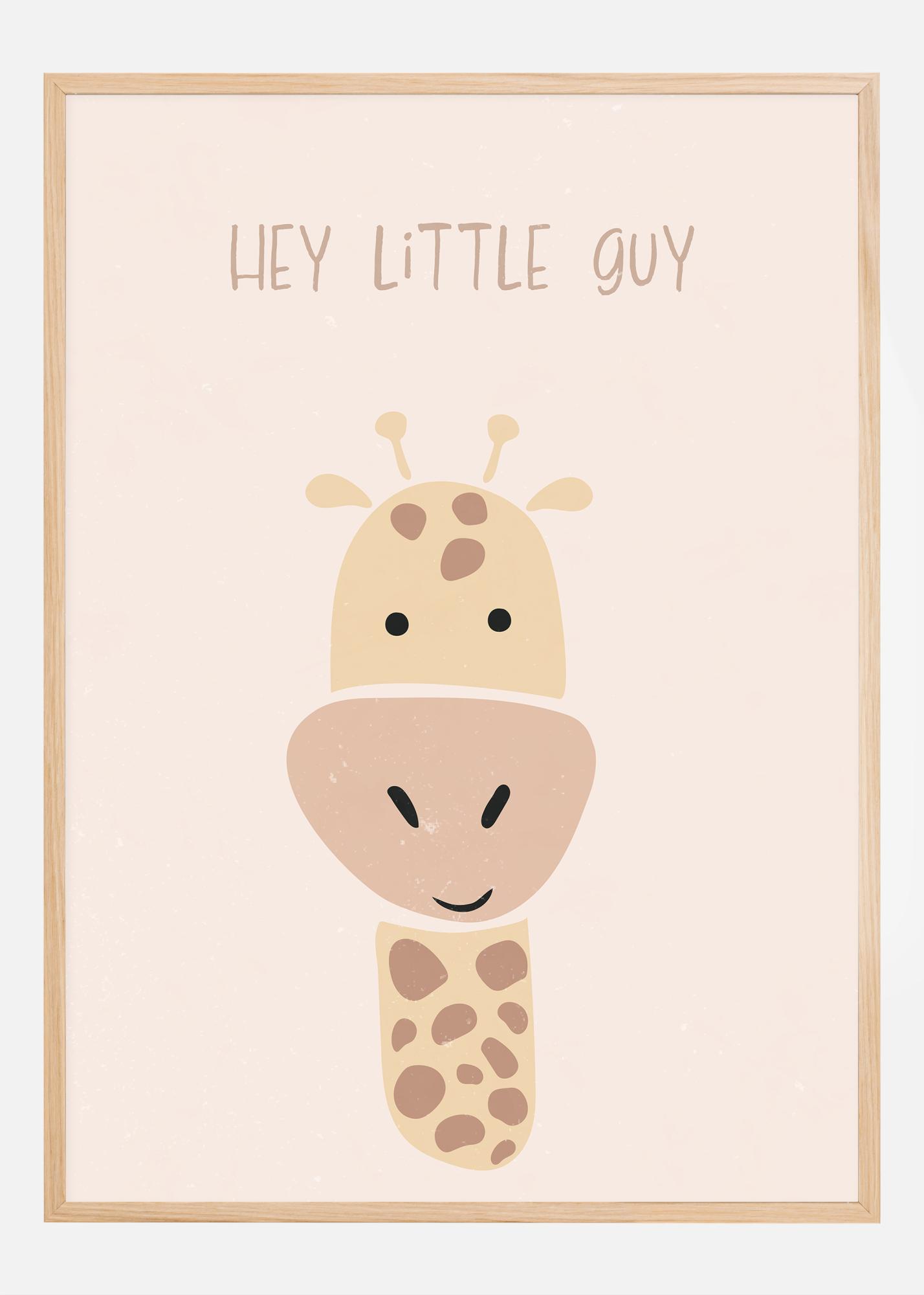 Este pôster encantador com a inscrição "HEY LITTLE GUY" e uma ilustração de um filhote de girafa é a decoração de parede perfeita para um quarto de criança ou um toque lúdico em outro quarto claro. O tema é caracterizado por cores suaves, como rosa suave no fundo e tons quentes de bege e marrom no desenho da girafa. A girafa desenhada, com seu design simples e amigável para crianças, traz um grande sorriso e olhos amigáveis, criando uma conexão imediata e contribuindo para uma atmosfera alegre e acolhedora.
