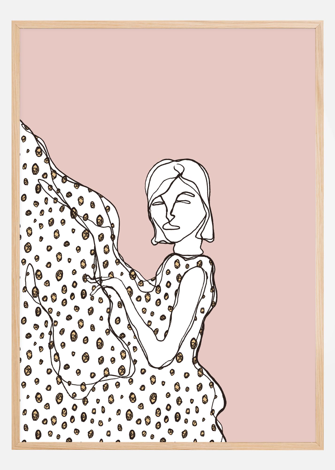 Um póster simples com uma garota desenhada em um vestido de bolinhas. O esboço grosseiro da menina cria movimento enquanto ela gira seu vestido para cima. As simples bolinhas se destacam contra o fundo rosa pastel pálido em que ela está em pé. Capture o olhar dela enquanto ela olha para si.
