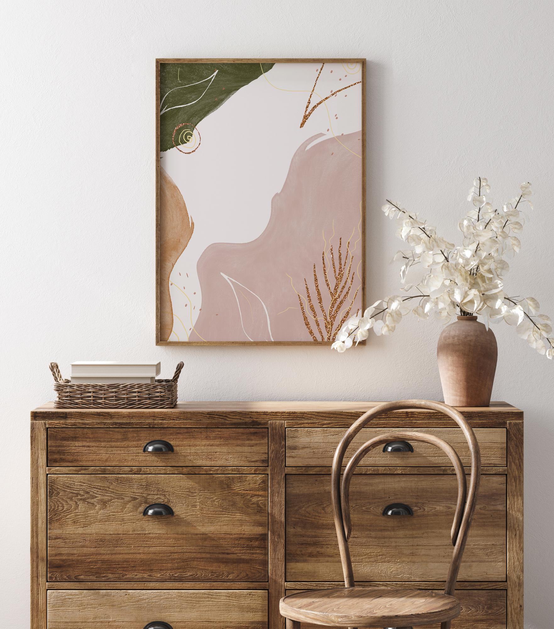 Um póster abstrato pacífico com folhas e detalhes brilhantes. Grandes blocos em forma de folha preenchem este póster com pequenos galhos e ramos criados em dourado brilhante. Combine isso com qualquer cor pastel para um belo complemento em sua parede.