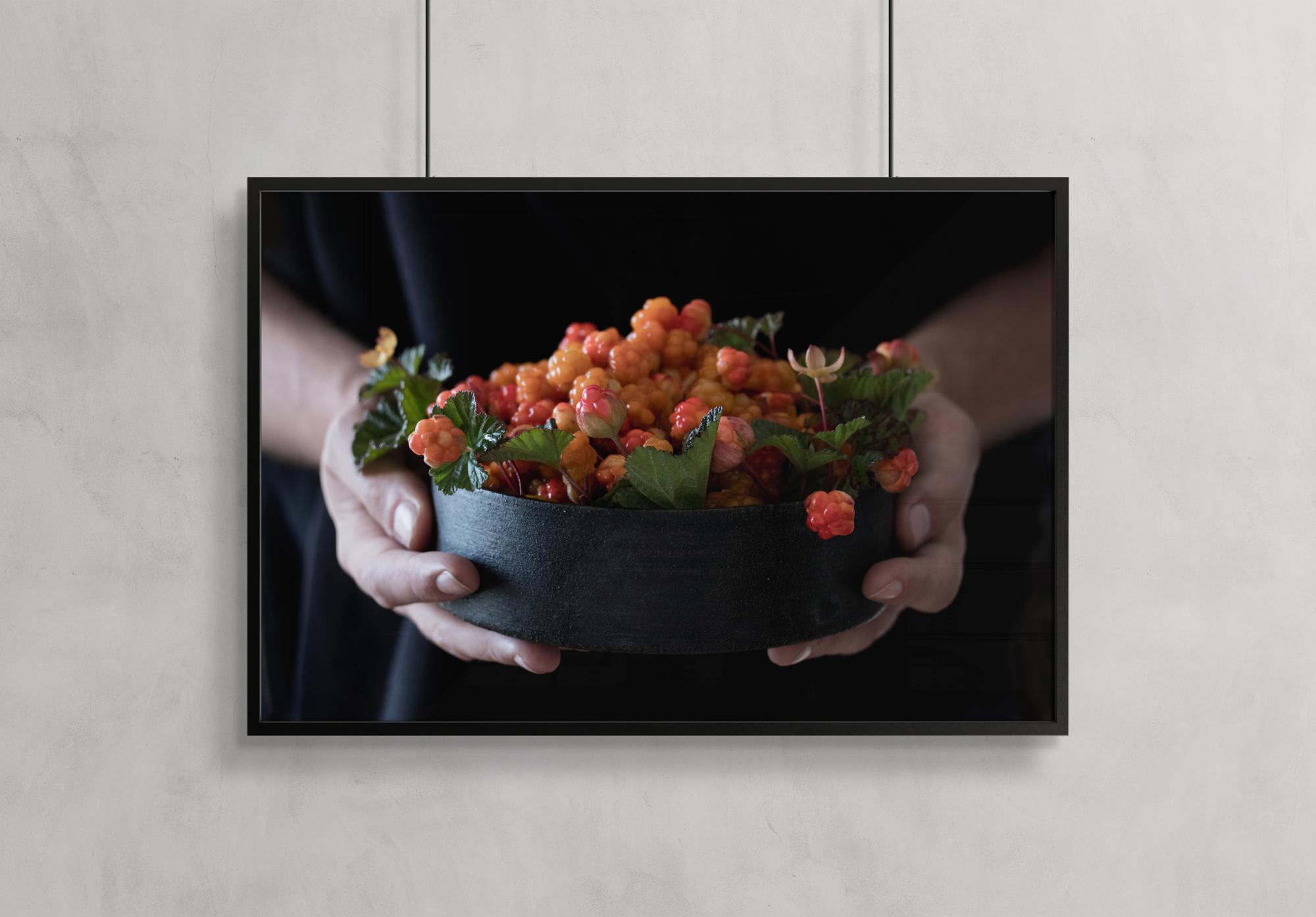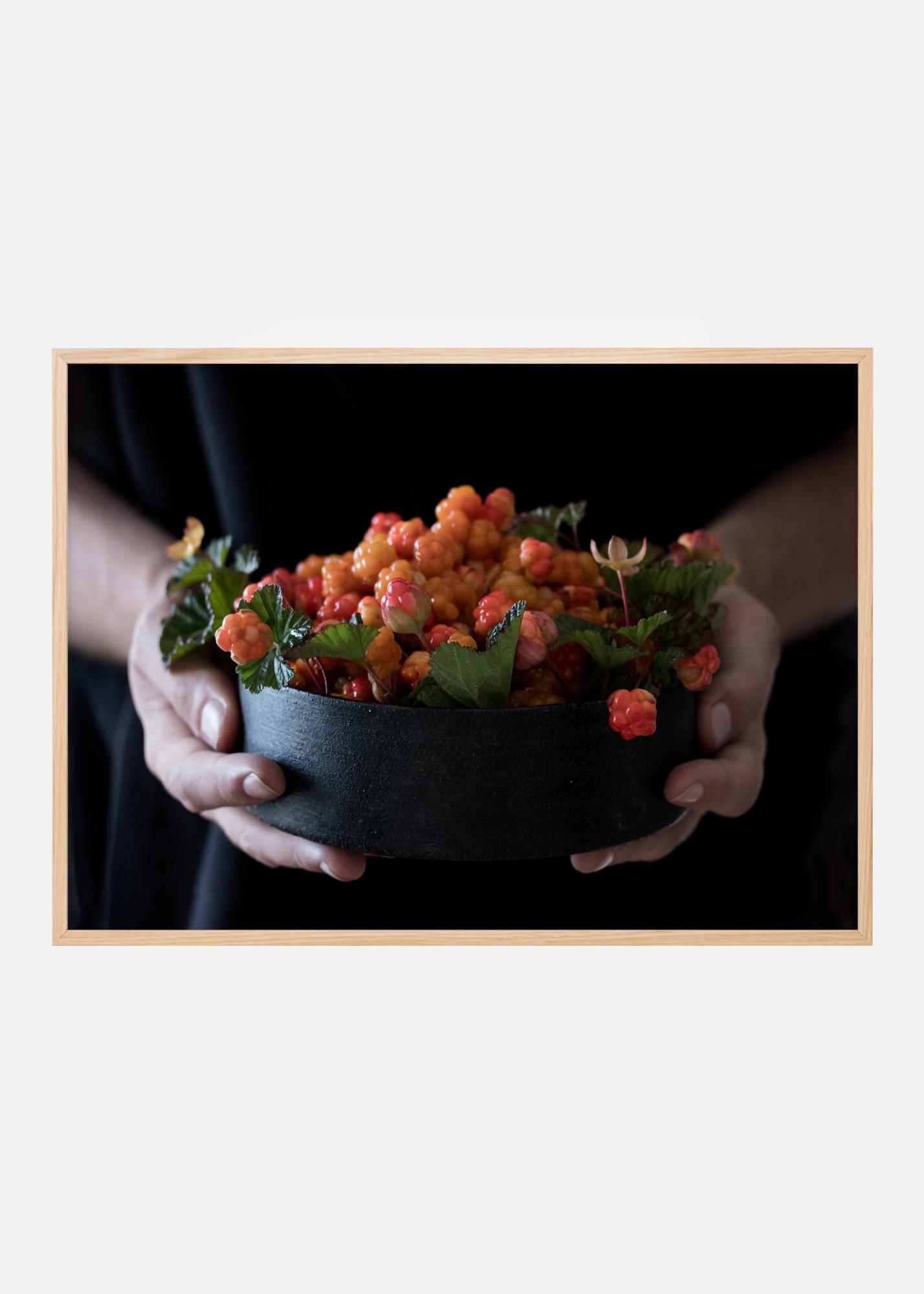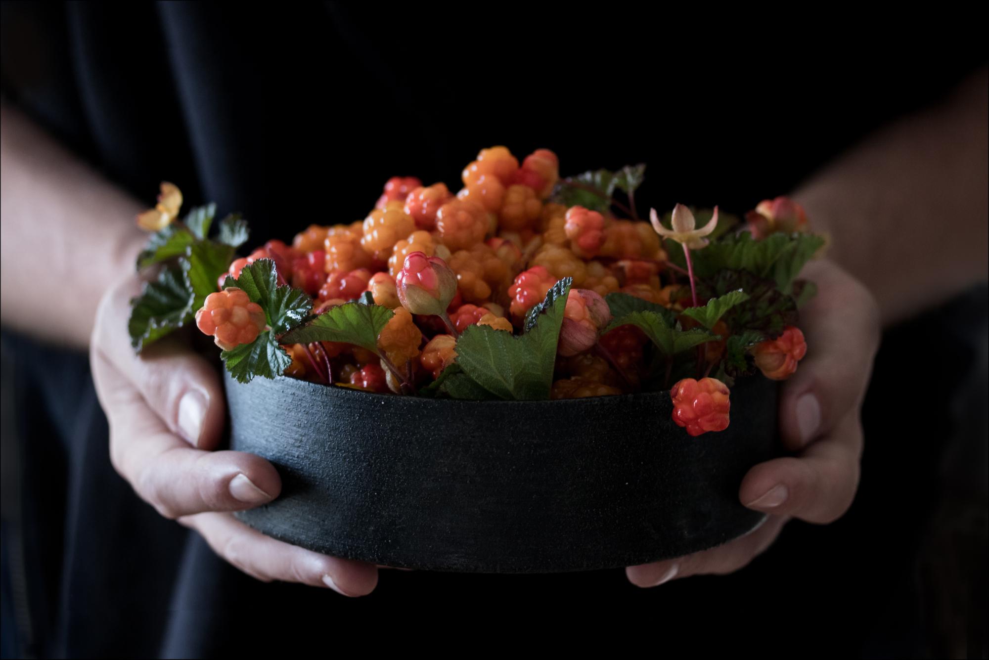 Uma imagem de frutas com bagas douradas em uma tigela segurada por duas mãos. Esta fotografia fresca mostra as bagas douradas e as folhas em uma tigela preta simples. Duas mãos seguram e oferecem como se estivessem prestes a entregar para ali e agora.