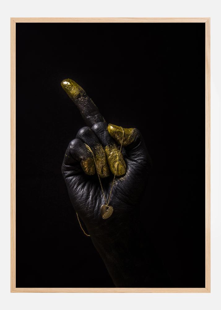 Um póster llamativo com uma mão preta com dedos dourados apontando para a esquerda. O punho fechado usa o dedo indicador para apontar para algo que não podemos ver. Ao redor da mão, há um medalhão dourado que cai elegantemente sobre os dedos dourados. Pendure isso numa parede branca ou creme para causar uma forte impressão.