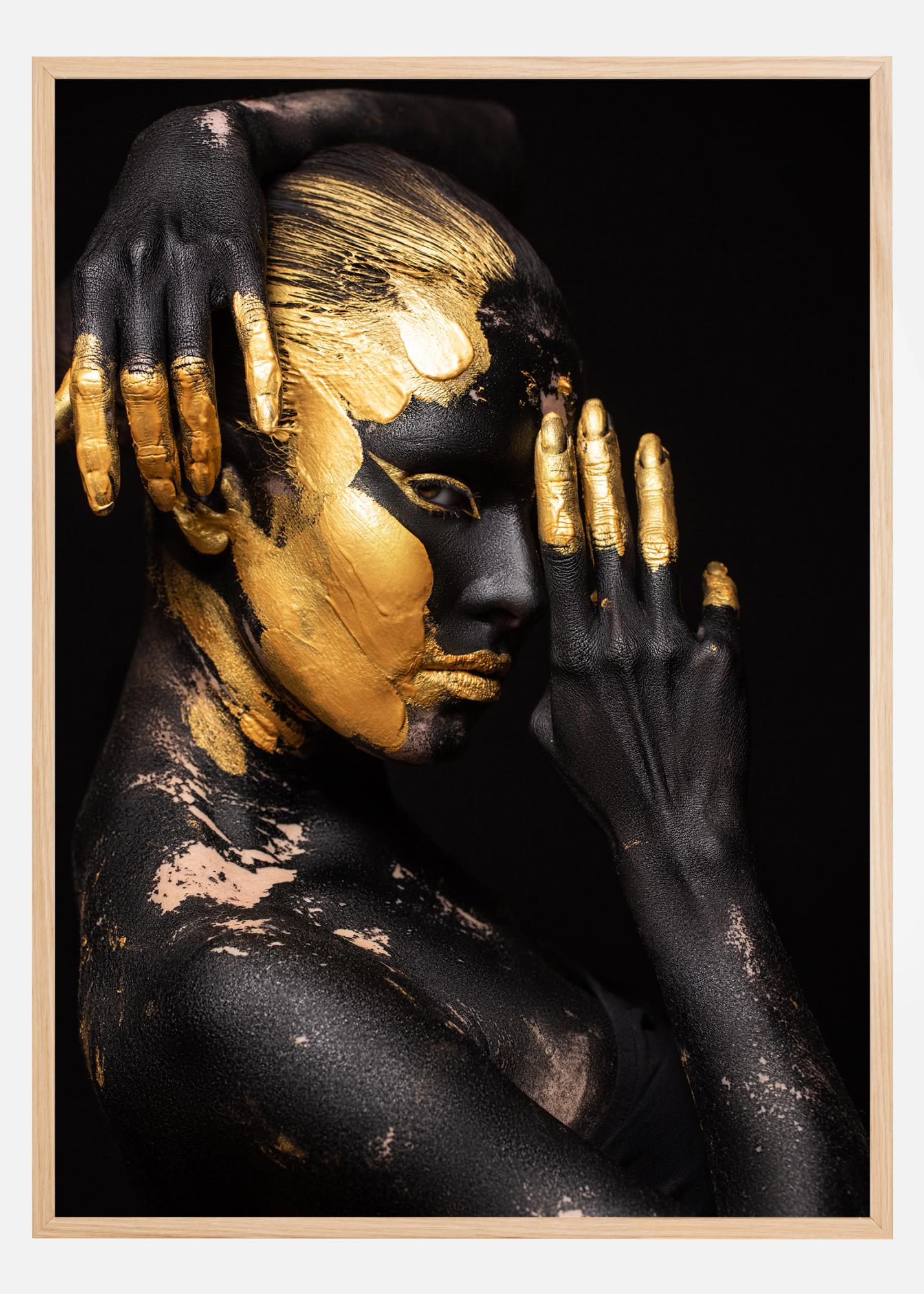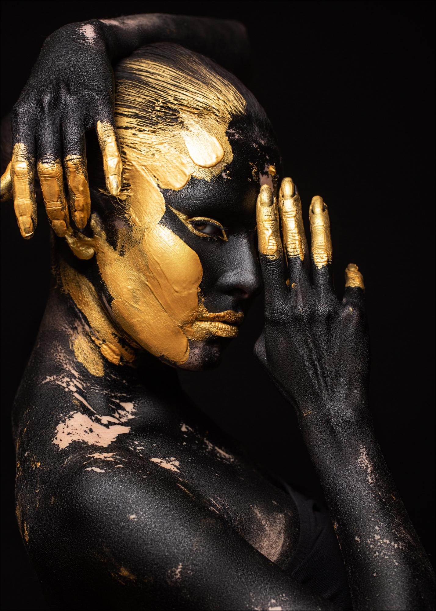 Um póster de retrato brilhante com o perfil de uma mulher segurando uma mão na frente do rosto, a outra mão está cobrindo a cabeça. A mulher é pintada em preto e dourado para criar um efeito llamativo e fazer com que as diferentes partes dela se destaquem enquanto ela olha para de soslaio.