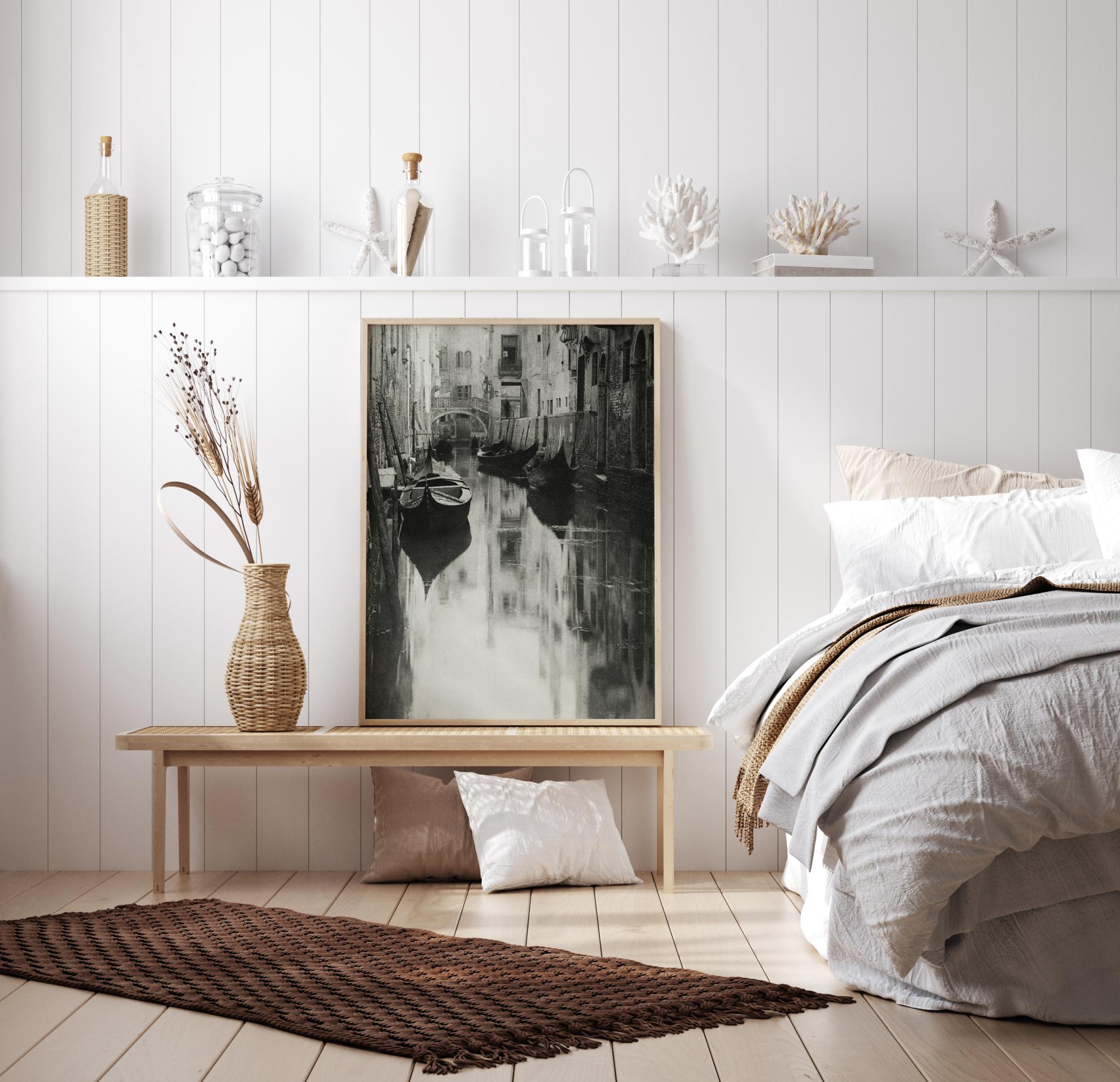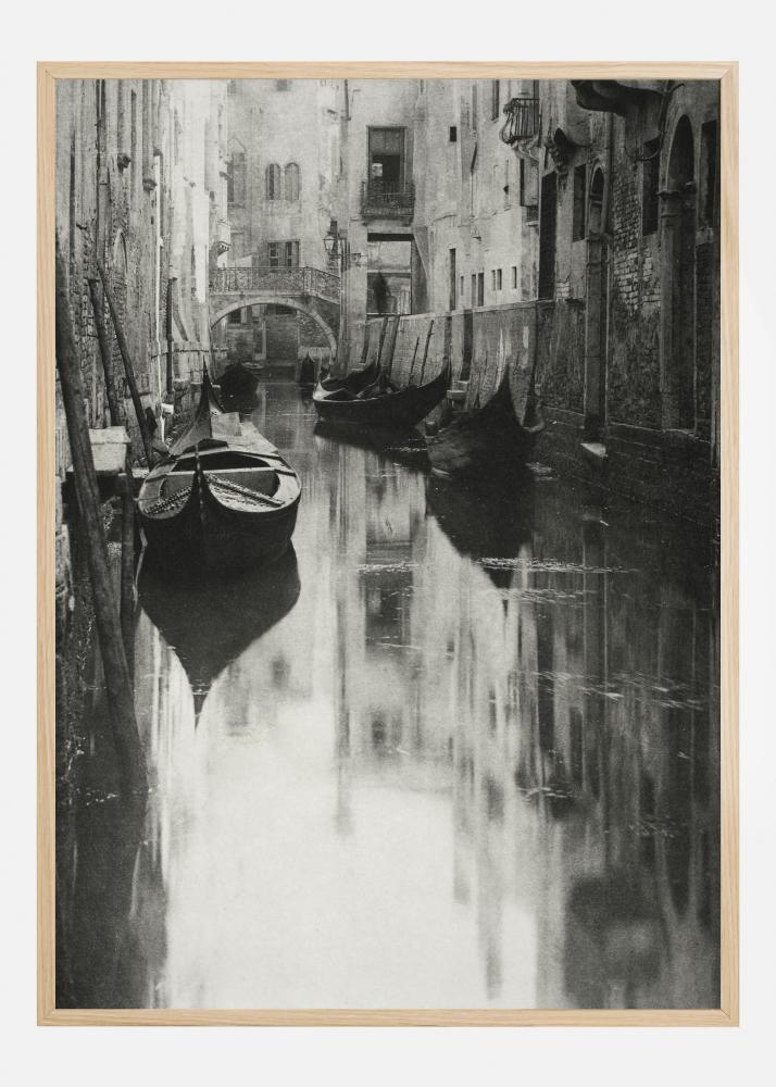 Um póster em preto e branco com gôndolas ancoradas em um canal em Veneza. Os barcos estão parados na água calma ao lado das íngremes paredes das casas. A imagem transmite calma e tranquilidade nesta parte isolada da cidade.