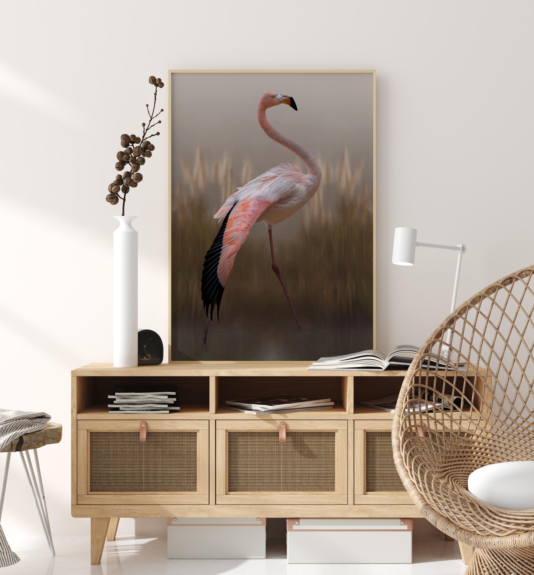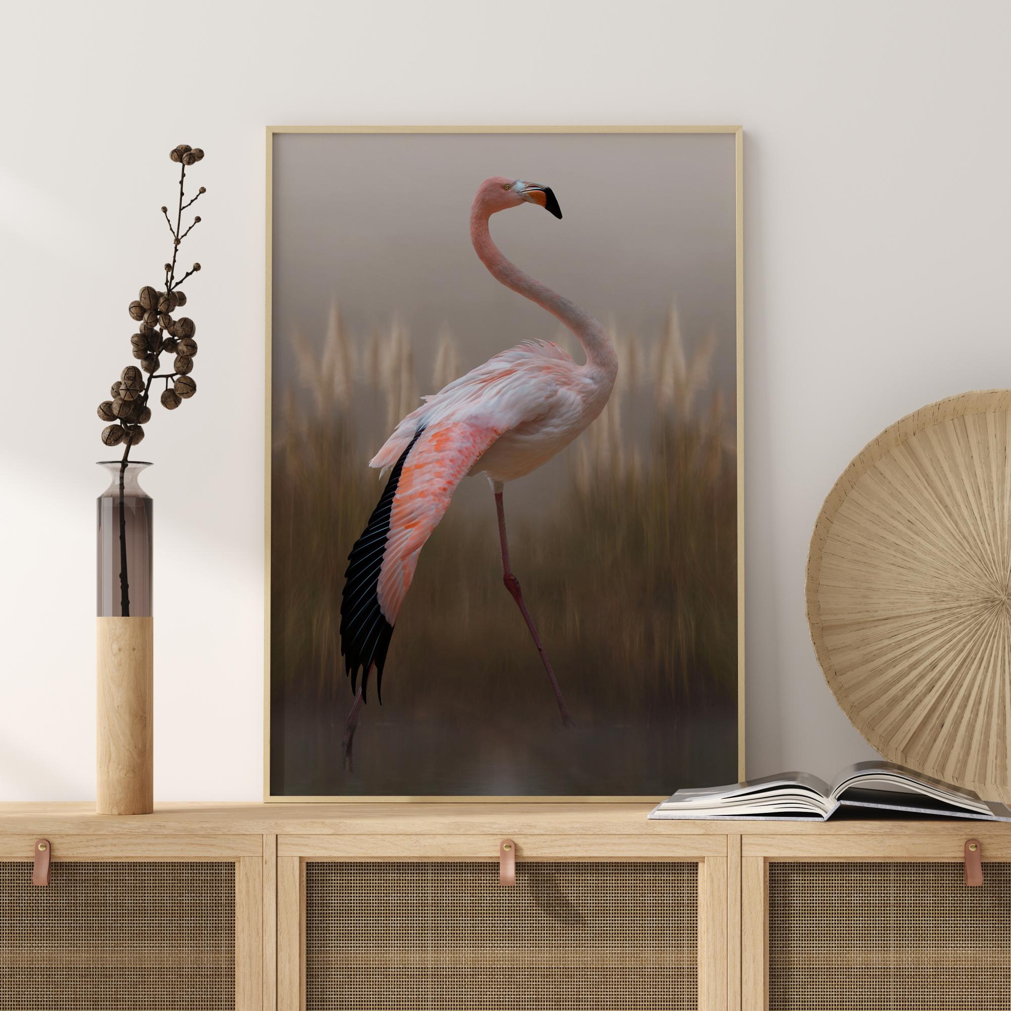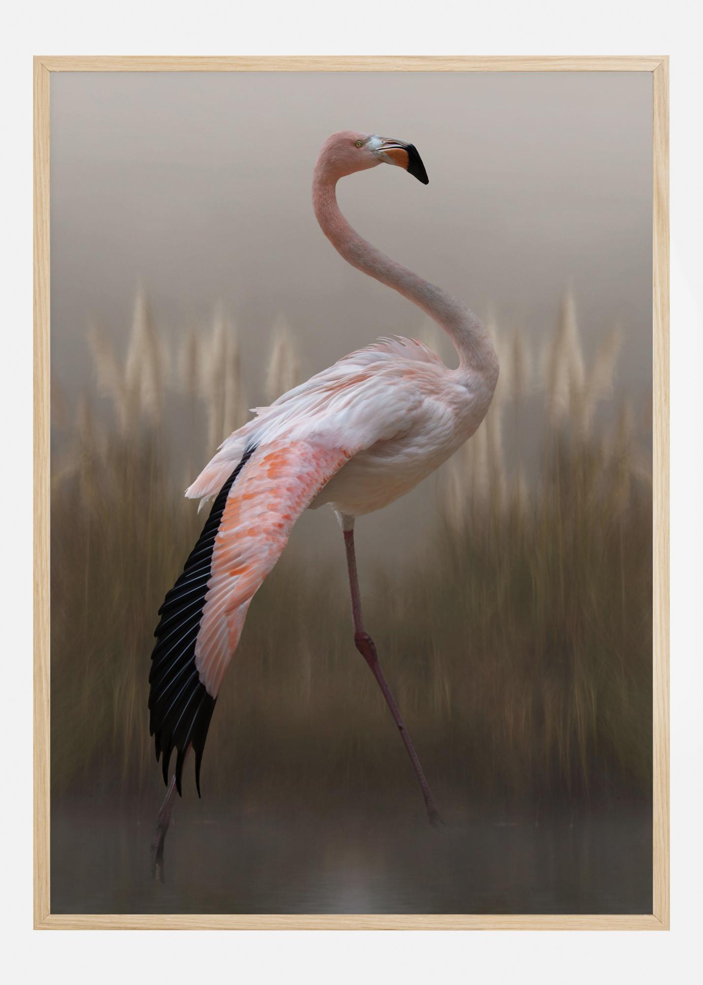 Um póster de animais com um flamingo rosa saltitante. As tonalidades de cor e o desfoque da foto quase dão a sensação de uma pintura. Pode fantasiar sobre estar saltitando junto com o pássaro ao combinar este póster com uma parede azul simples.