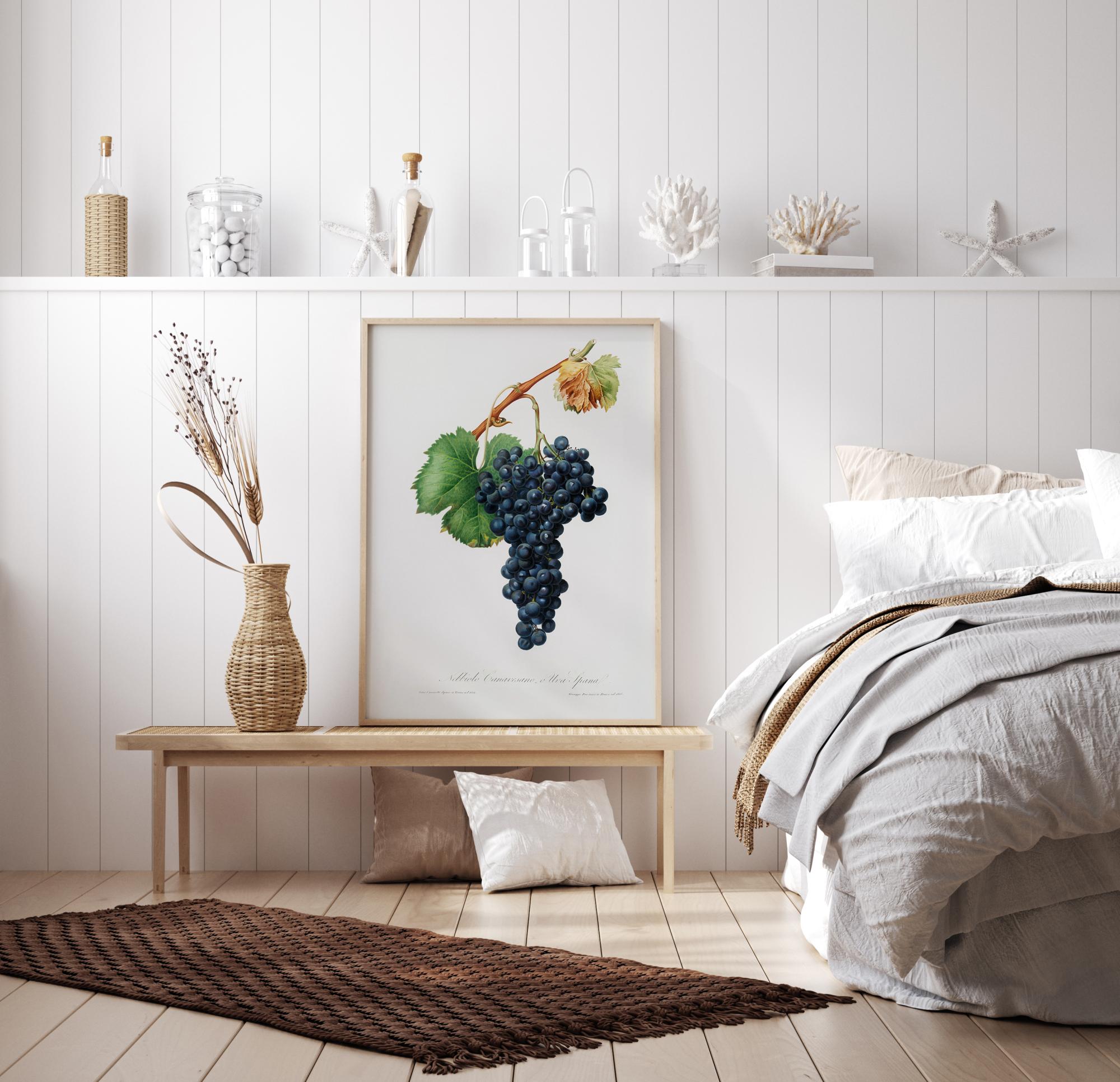 Um póster botânico detalhado com muitas uvas azuis escuras em uma videira pendurada no centro sobre um fundo branco. As uvas brilhantes e pretas parecem suculentas e deliciosas, balançando de forma tentadora no centro da imagem. Pendure isso em sua cozinha para um pouco de inspiração culinária.