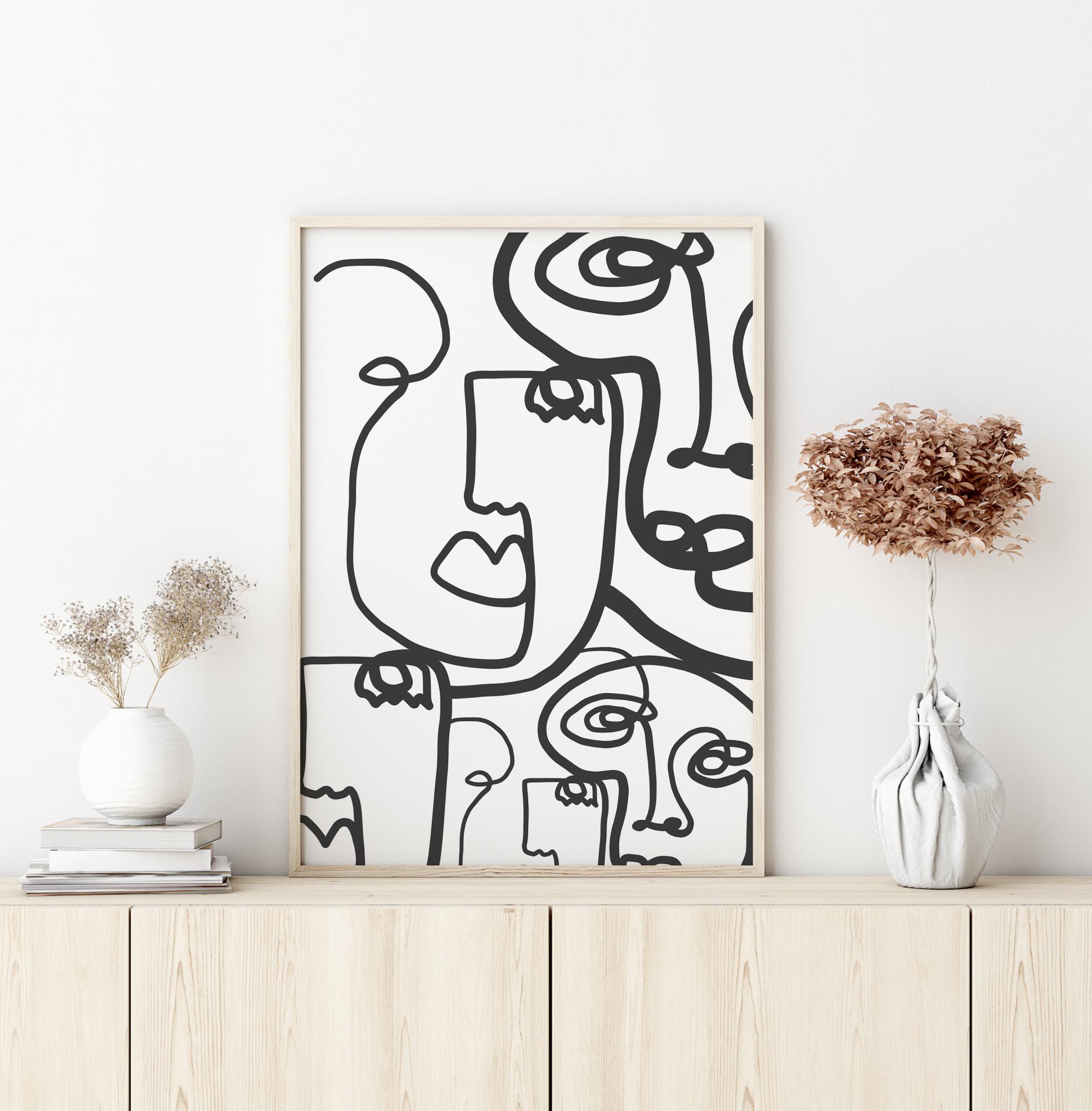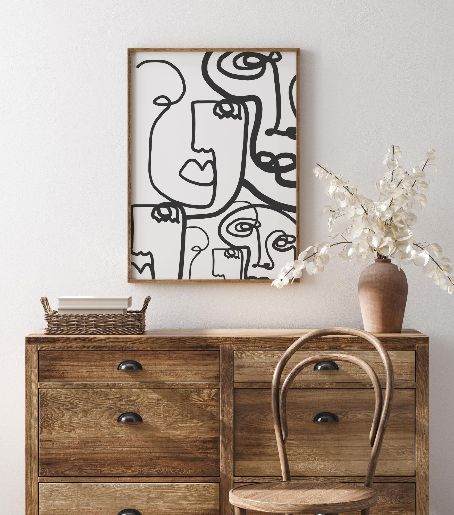 Um póster abstrato llamativo com muitos rostos desenhados. Linhas pretas grossas e finas preenchem esta imagem para criar cinco rostos separados. As linhas giram ao redor do fundo branco, então você precisa se concentrar para encontrar todos os rostos escondidos nesta imagem vívido.