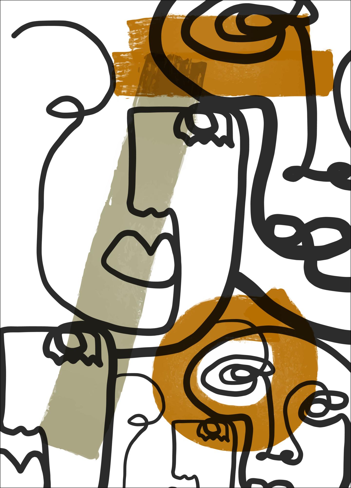 Um póster de arte gráfica de linha com rostos pintados em preto sobre um fundo branco, cinzento e marrom. Um póster abstrato e vívido que encaixa-se perfeitamente numa casa moderna e fica tão bom na cozinha e no corredor quanto na sala de estar ou no quarto.
