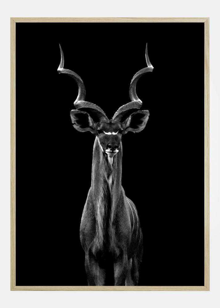 Um póster selvagem com um Kudu maior que fica imponente num fundo preto. Esta majestosa antílope encara a câmera, os chifres torcidos se estendem para cima para preencher a imagem. Adicione este incrível retrato em preto e branco de animais à sua casa para um toque de magnificência.