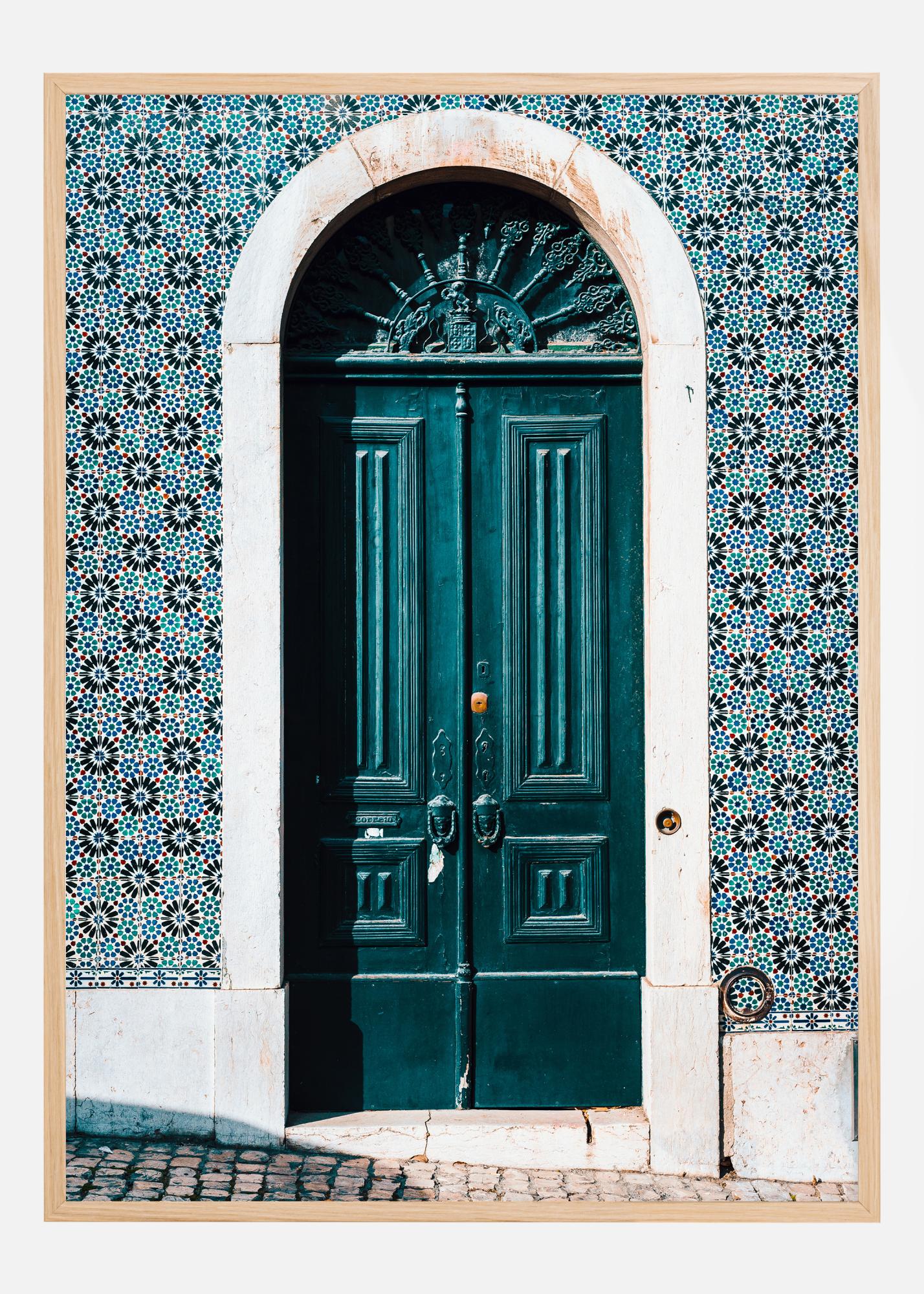 Este cartaz elegante mostra uma imponente porta verde, lindamente emoldurada por azulejos tradicionais detalhados em azul e branco. O design clássico e a cor ousada da porta contrastam com os padrões intrincados, criando uma sensação de boas-vindas e riqueza cultural. A imagem transmite a sensação de uma entrada acolhedora para uma casa cheia de história e caráter.