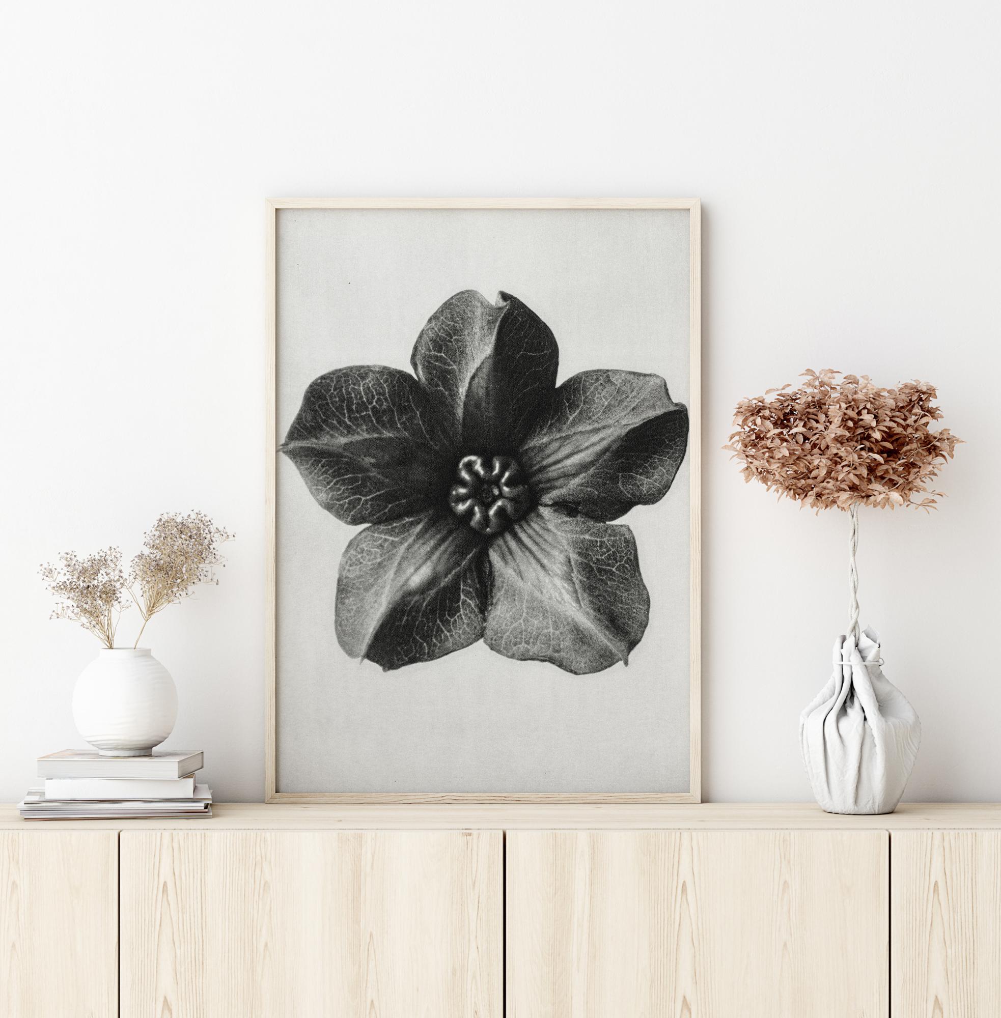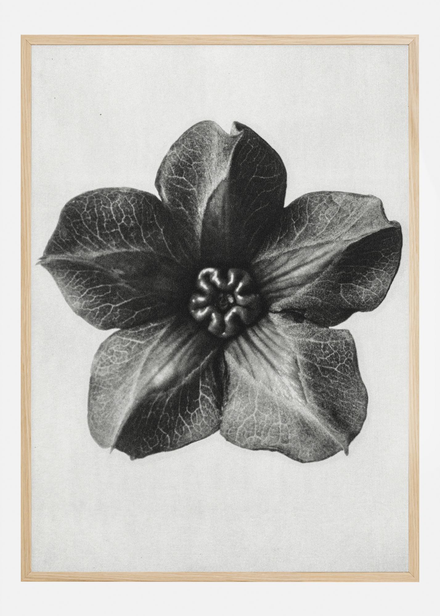 Uma bela impressão botânica com uma única planta em plena floração. Uma impressão simples, mas bonita, pintada em preto e branco e representando uma flor de cinco pétalas. Decore a sua parede com um póster botânico para criar uma sensação natural em sua casa.