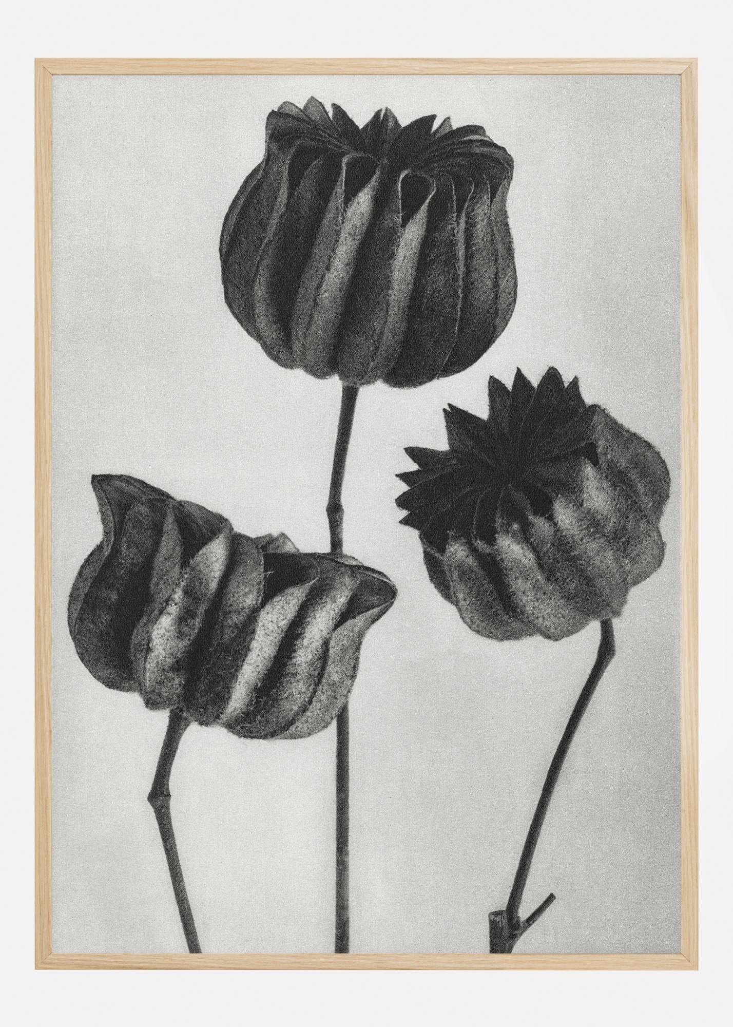 Uma linda impressão moderna em preto e branco com três flores em alturas diferentes. A flor central tem um caule reto, enquanto as outras duas são curvas. Em seu fundo branco, este póster simples mas delicado é perfeito para pendurar numa parede clara em uma sala de estar.