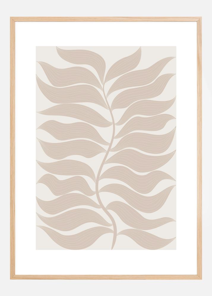 Um póster botânico com folhas. Esta pintura delicada retrata uma imagem suave e simples de onze folhas em cada lado de um caule. Num fundo branco, esta é a impressão perfeita para todos os amantes da natureza ou aqueles interessados em folhas.