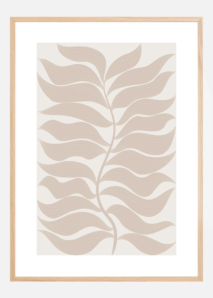 Um póster botânico com folhas. Esta pintura delicada retrata uma imagem suave e simples de onze folhas em cada lado de um caule. Num fundo branco, esta é a impressão perfeita para todos os amantes da natureza ou aqueles interessados em folhas.