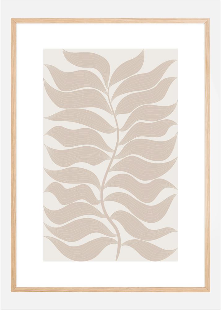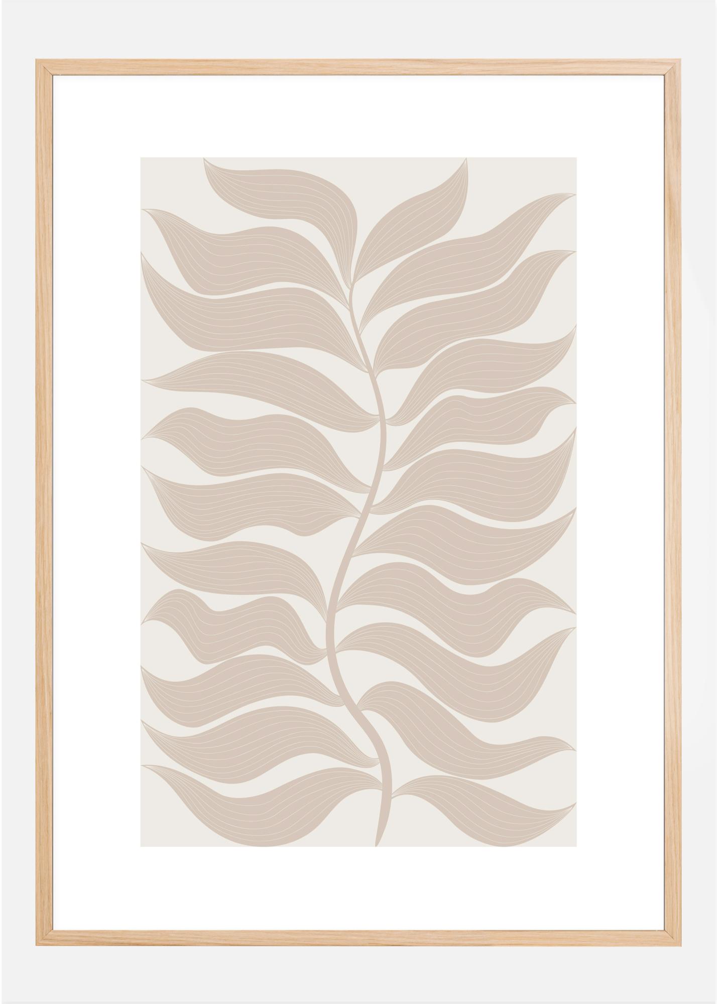 Um póster botânico com folhas. Esta pintura delicada retrata uma imagem suave e simples de onze folhas em cada lado de um caule. Num fundo branco, esta é a impressão perfeita para todos os amantes da natureza ou aqueles interessados em folhas.