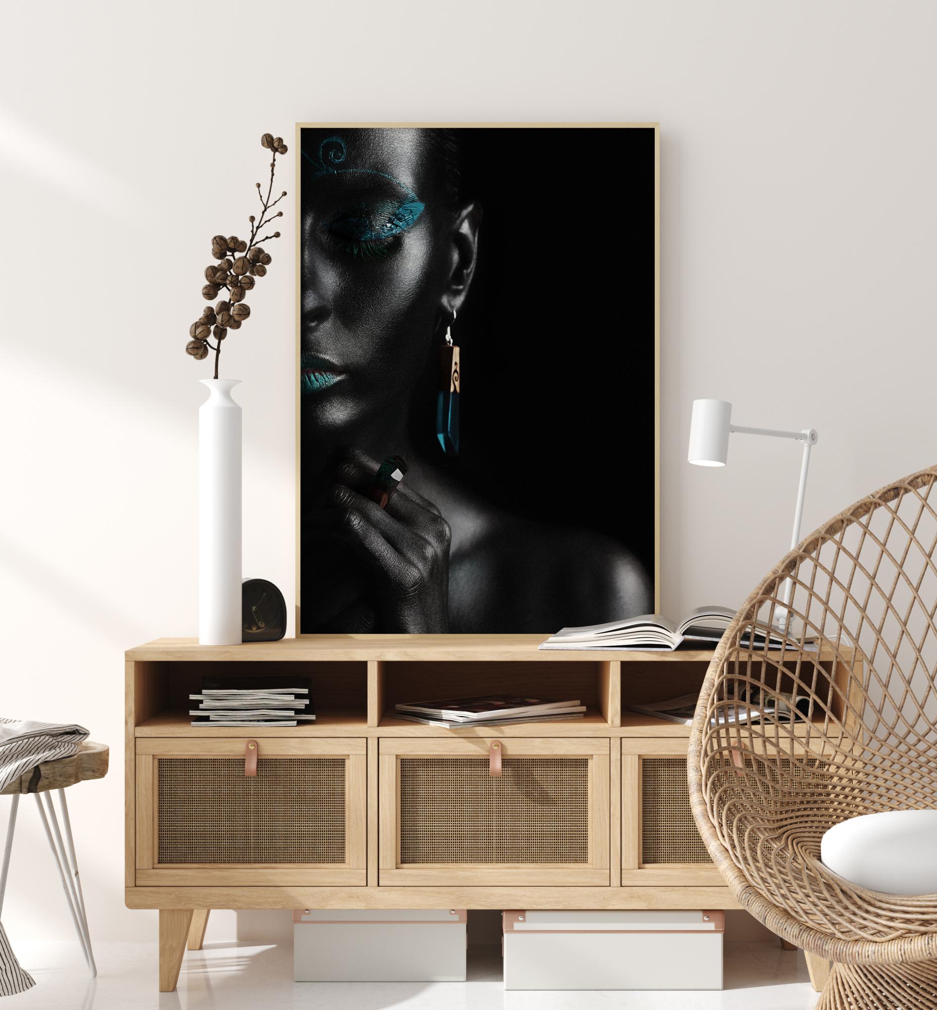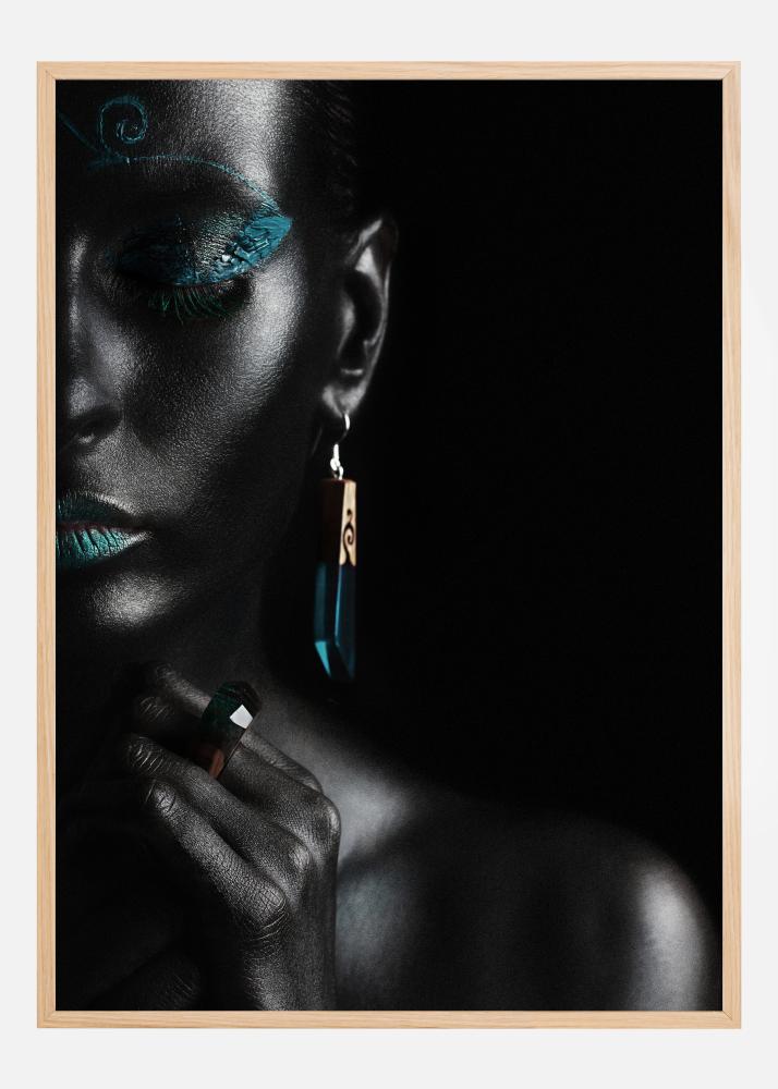 Um póster impressionante que retrata uma bela mulher profundamente absorta em pensamentos. Pintado num fundo preto, os olhos e a boca da mulher são realçados numa cor verde-turquesa profunda. A luz da janela ilumina o rosto da mulher. A luz realça todos os detalhes, tornando este um retrato perfeito numa parede branca e vazia.