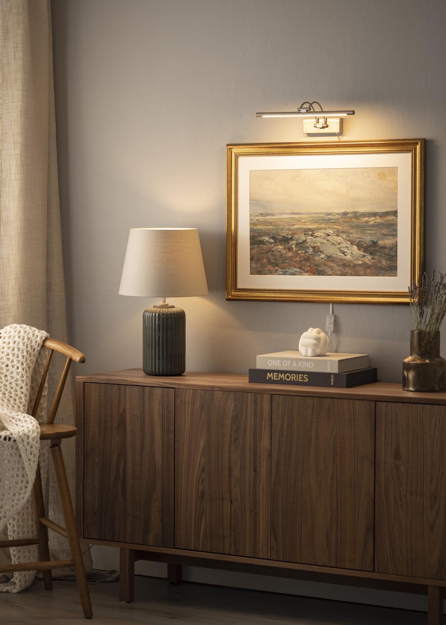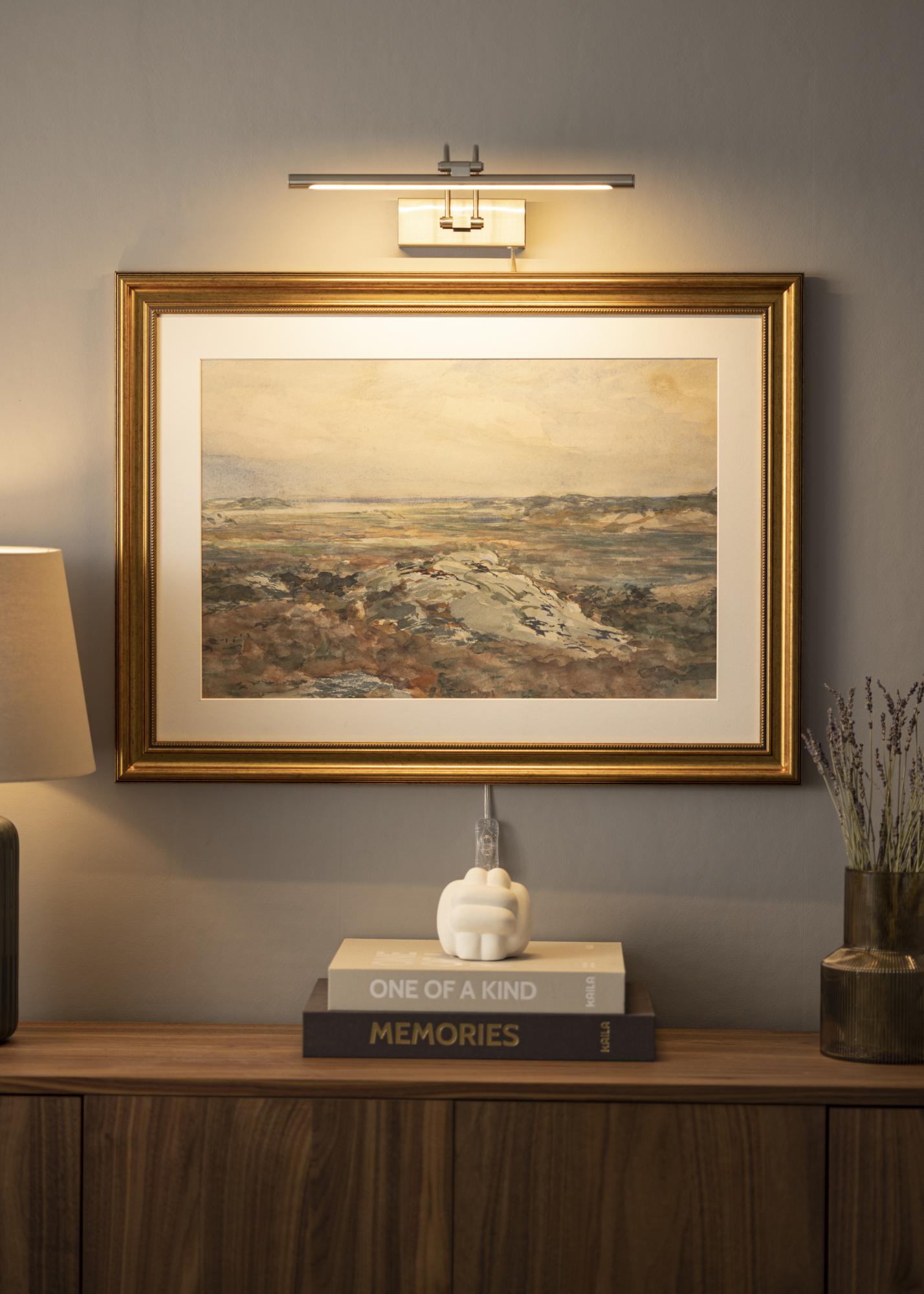 Iluminação de quadros em design moderno sueco que se adapta a quadros com uma largura de 60-100 cm. A luminária tem uma altura de 5 cm e um comprimento de 37 cm, com uma distância da parede de 20 cm. Com a sua forte iluminação de LED de 720 lúmens, obtém uma iluminação agradável mesmo em quadros maiores.