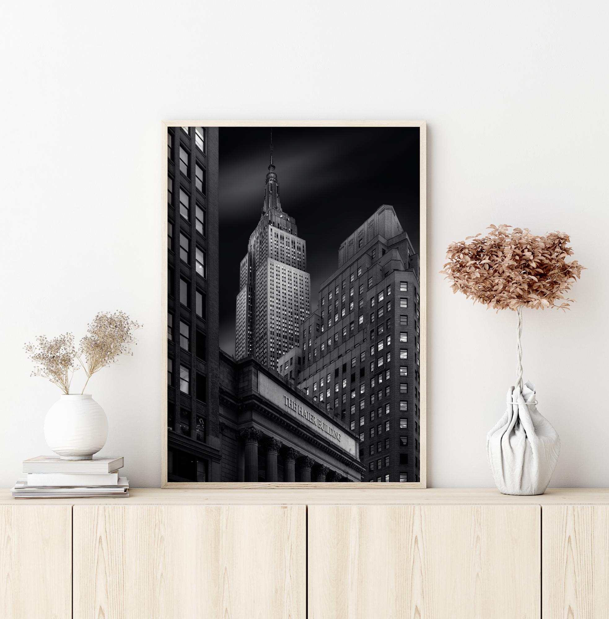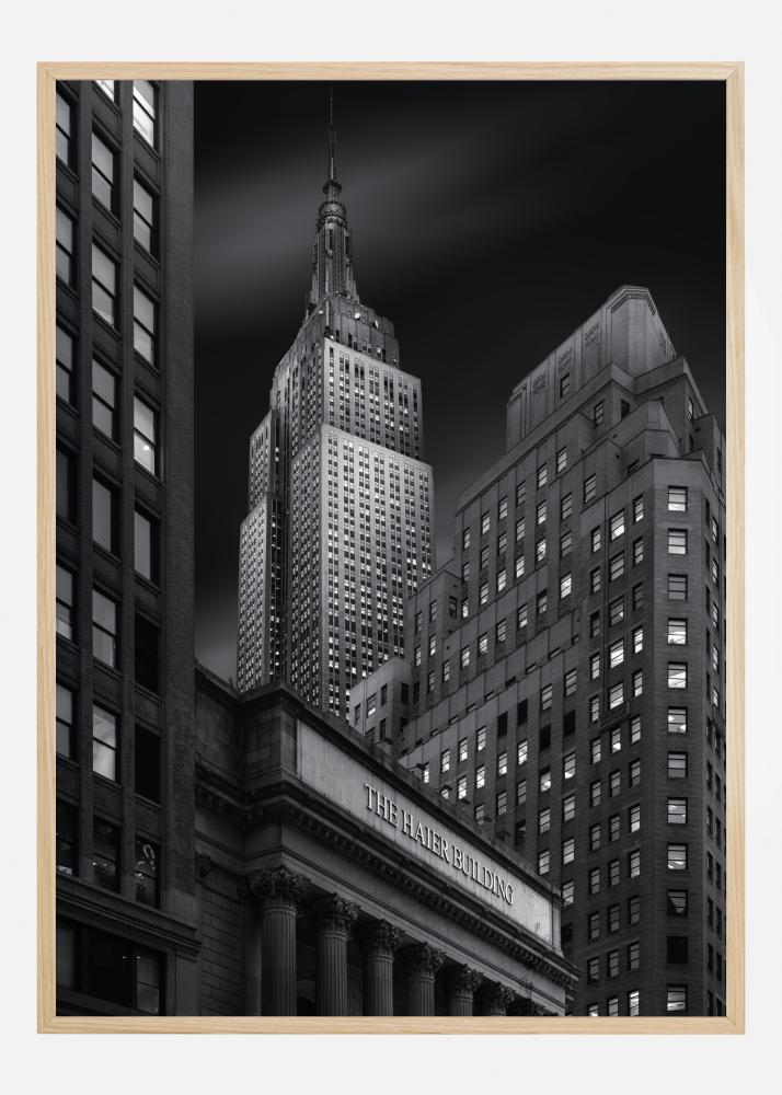 Um póster do Edifício Haier em Nova Iorque à noite. As letras douradas brilhantes do prédio iluminam e dizem "O Edifício Haier". Com os prédios em contraste com uma vista noturna da cidade, esta é uma imagem muito marcante. Este póster preto e branco llamativo do centro de Nova Iorque é perfeito numa parede branca.