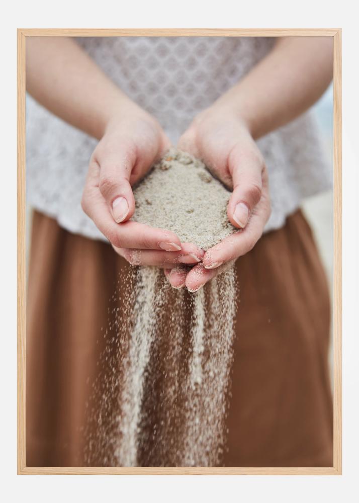 Um póster a suave e calmante com uma menina segurando areia nas suas mãos. A areia fina escorre entre seus dedos. Vestida com roupas sutilmente coloridas, torna-se uma imagem muito relaxante. Uma foto tranquila e relaxante que ficaria perfeita numa parede bege em qualquer um das divisões da sua casa.