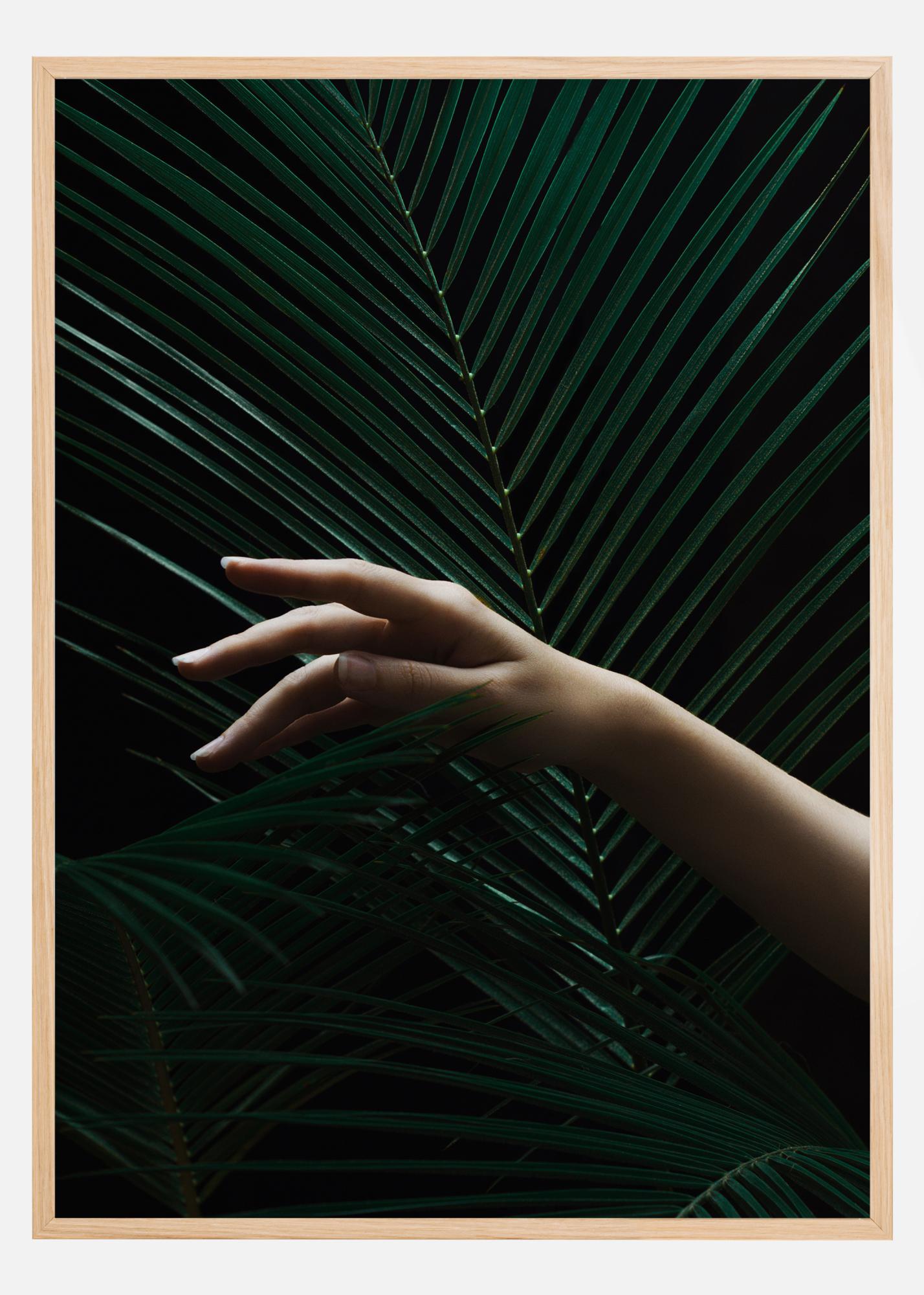 Uma fotografia botânica de ramos verdes semelhantes a palmeiras em frente a um fundo preto. Uma mão estendida contribui com um elemento vivo e contrastante. Um póster sombrio que encaixa-se perfeitamente numa galeria de parede maior.