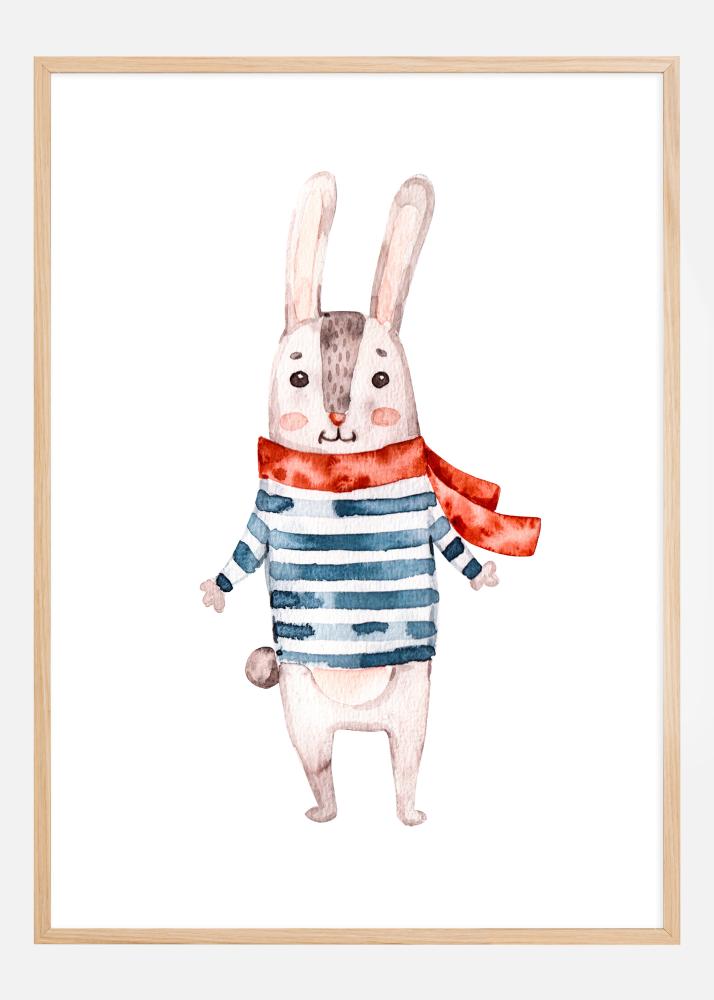Este pôster encantador retrata um coelho alegre vestido com uma camisa listrada e um cachecol vermelho esvoaçante. O sorriso caloroso do coelho e sua postura brincalhona irradiam alegria e inocência, criando uma sensação afetuosa e acolhedora. A ilustração, executada em tons suaves de aquarela, possui uma leveza e simplicidade que proporcionam um efeito tocante e nostálgico.
