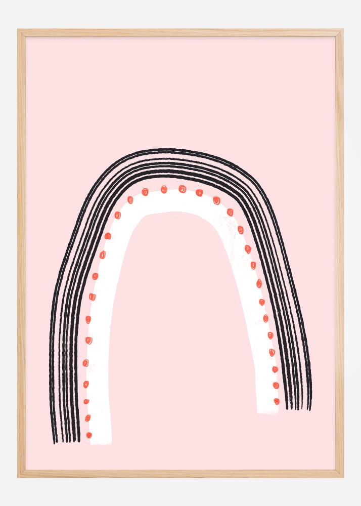 Este cartaz lúdico e encantador retrata um arco-íris estilizado com uma abordagem moderna e gráfica. Contra um fundo rosa claro, os contornos negros e marcantes dos arcos do arco-íris criam um contraste nítido, enquanto linhas de pequenos corações vermelhos seguem uma das curvas, adicionando uma sensação irresistível de alegria e positividade. Esta impressão irradia simplicidade e alegria e poderia iluminar qualquer ambiente com seu charme e expressão amigável.
