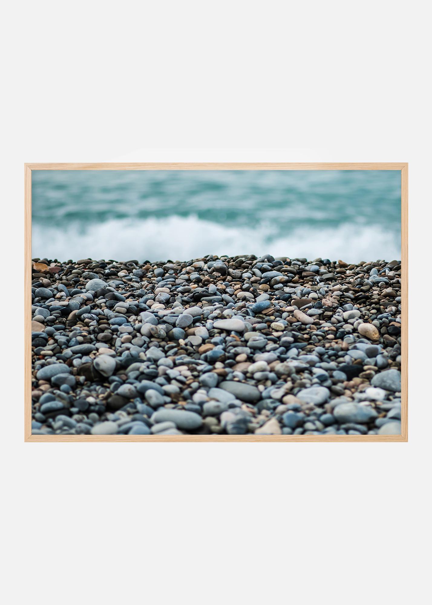 Ouça o som das ondas do mar neste póster com uma bela praia de pedras na frente. A profundidade de campo curta cria uma imagem interessante que atrai os olhos para a imagem. Você consegue encontrar algum pedaço de vidro polido entre as pedras? A paleta de cores cinzento-azuladas combina bem com uma moldura estreita numa parede clara, de preferência com acessórios marinhos.