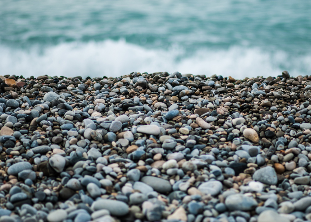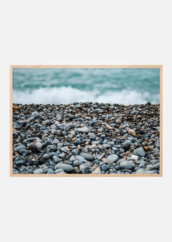 Ouça o som das ondas do mar neste póster com uma bela praia de pedras na frente. A profundidade de campo curta cria uma imagem interessante que atrai os olhos para a imagem. Você consegue encontrar algum pedaço de vidro polido entre as pedras? A paleta de cores cinzento-azuladas combina bem com uma moldura estreita numa parede clara, de preferência com acessórios marinhos.
