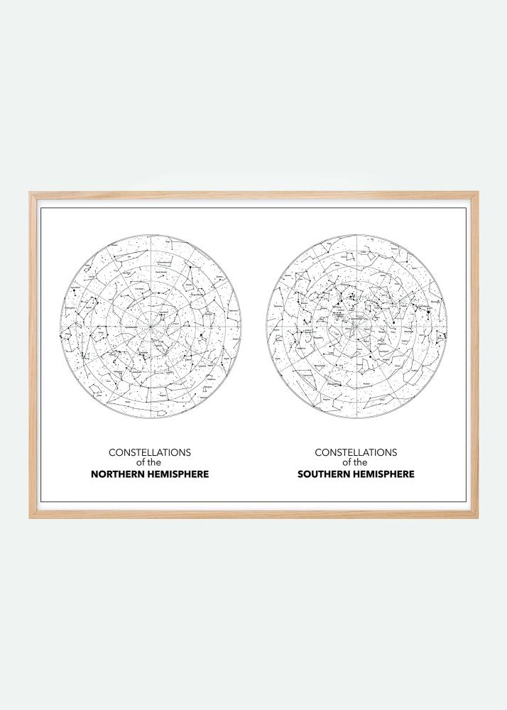Uma impressão em preto e branco do céu estrelado do norte e do sul. Contra o fundo branco, as constelações são levemente delineadas em preto. Coloquedas lado a lado, pode admirar o mistério das estrelas. Pendure esta imagem em seu escritório e crie uma sensação de infinitude.