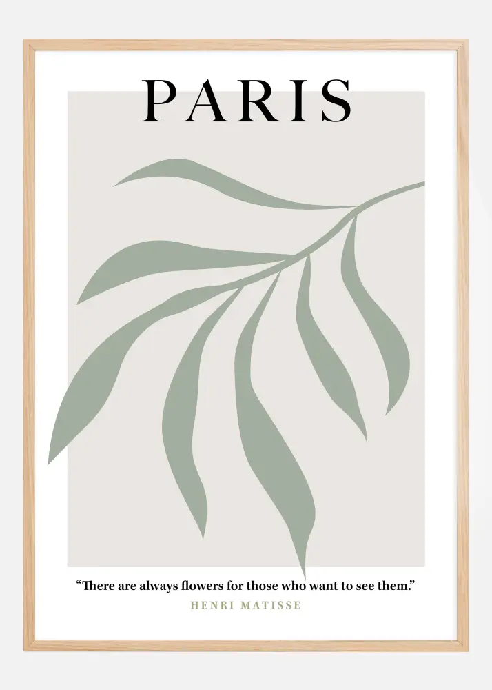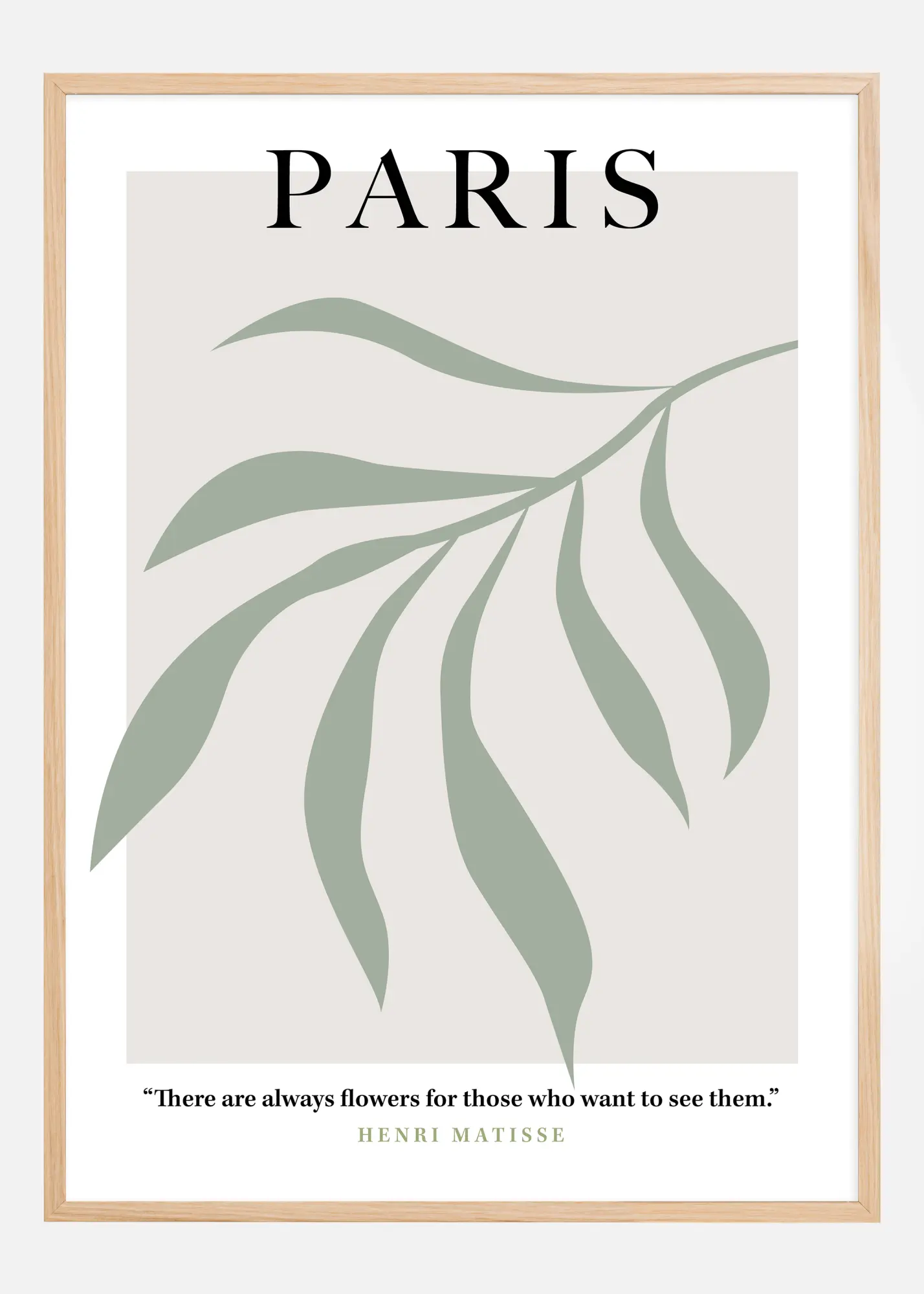 Este poster elegante e estiloso exibe a palavra "PARIS" em letras grandes, sobre um fundo de linhas verde suave que formam uma forma abstrata e orgânica, lembrando jardins tranquilos e frescos. Sua paleta discreta proporciona uma sensação de paz e elegância sutil, refletindo a reputação da cidade como um centro de beleza e cultura. É complementado por uma citação inspiradora de Henri Matisse, que confere à peça um senso de sabedoria artística: "There are always flowers for those who want to see them."