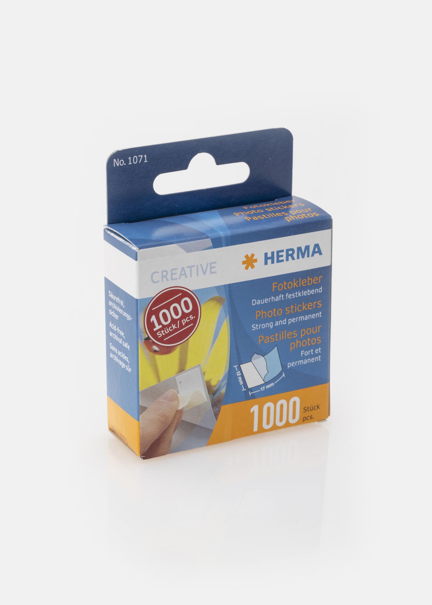 Os adesivos fotográficos Herma são adesivos dupla face usados para fixar permanentemente fotos. O produto é livre de ácido e seguro para as suas fotos. A embalagem contém um total de 1000 adesivos fotográficos.