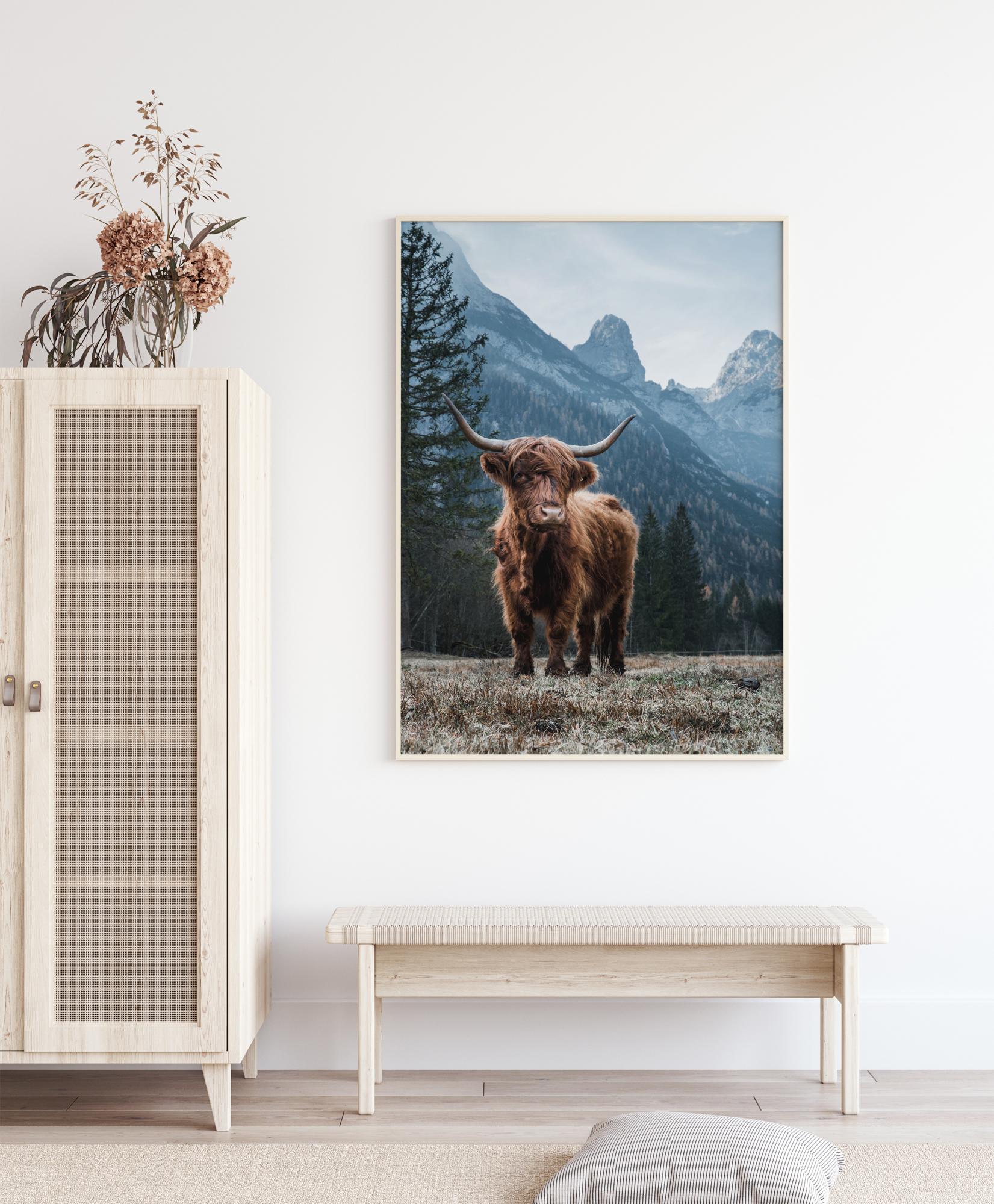 Um póster selvagem de uma vaca de montanha vermelho-marrom, sozinha em um campo. As montanhas íngremes cobertas de neve emolduram esse belo animal. Com a sua pelagem curta e felpuda, que suporta condições áridas, o animal parece não se incomodar com nada. Use sua imaginação e imagine-se nas terras altas da Escócia.