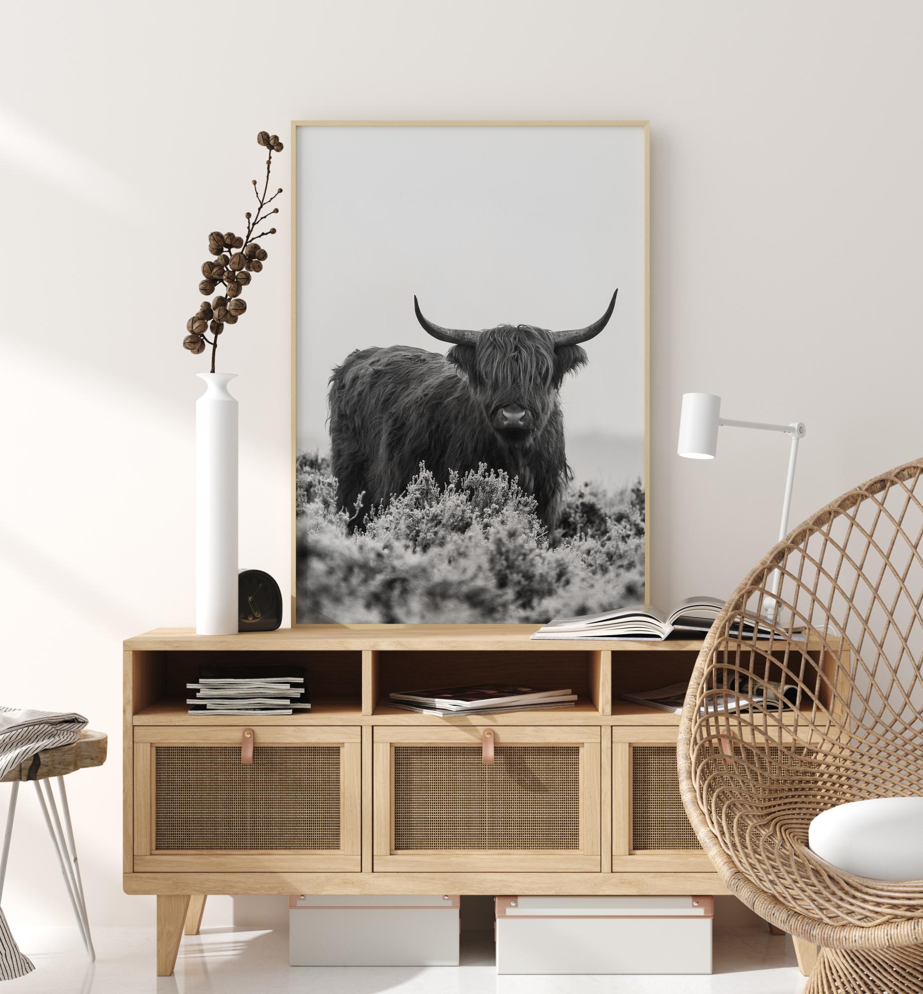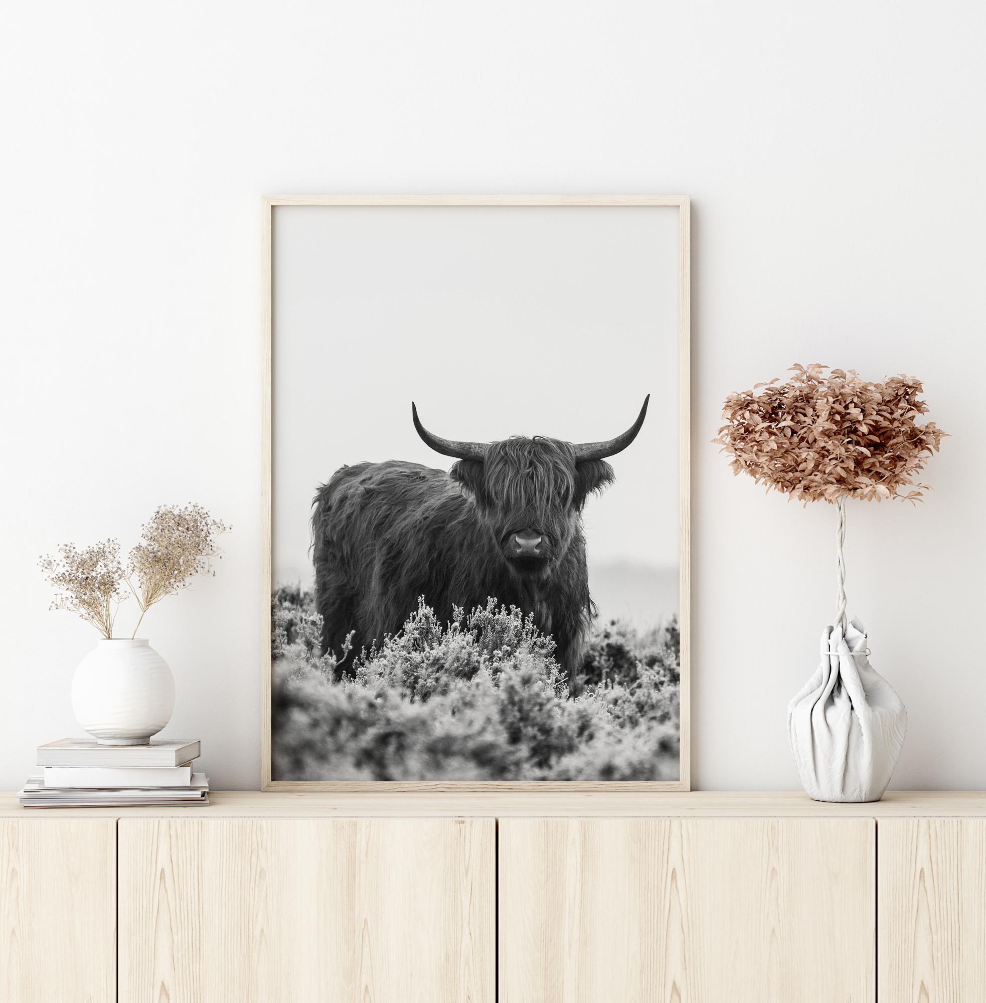 Um belo póster de animais que retrata uma vaca solitária na charneca. Rodeado por grama alta, este magnífico animal olha diretamente para a câmera. Enquanto está em pé contra um céu cinzento e grama alta, quase pode sentir o vento frio no rosto. Uma imagem perfeita para todos os amantes de animais.
