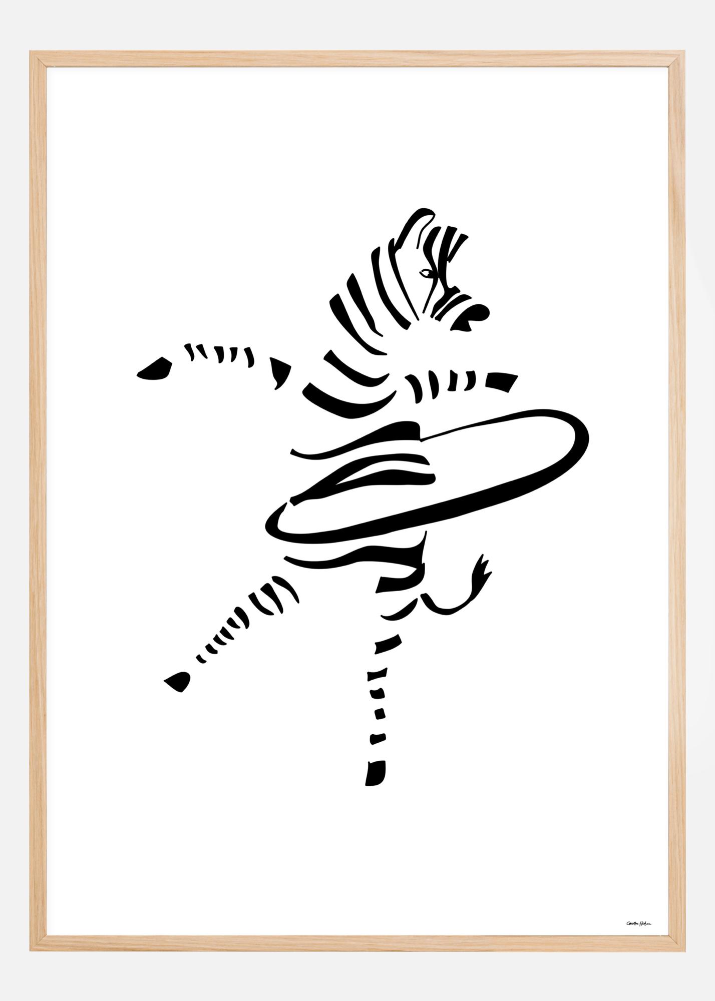 Um retrato minimalista de uma zebra dançante. Num fundo branco, os traços de pincel pretos habilmente formam a forma da zebra. Esta zebra adorável está em pé nas patas traseiras e dançando com um bambolê. Um póster simples, mas divertido, para pendurar numa parede simples.