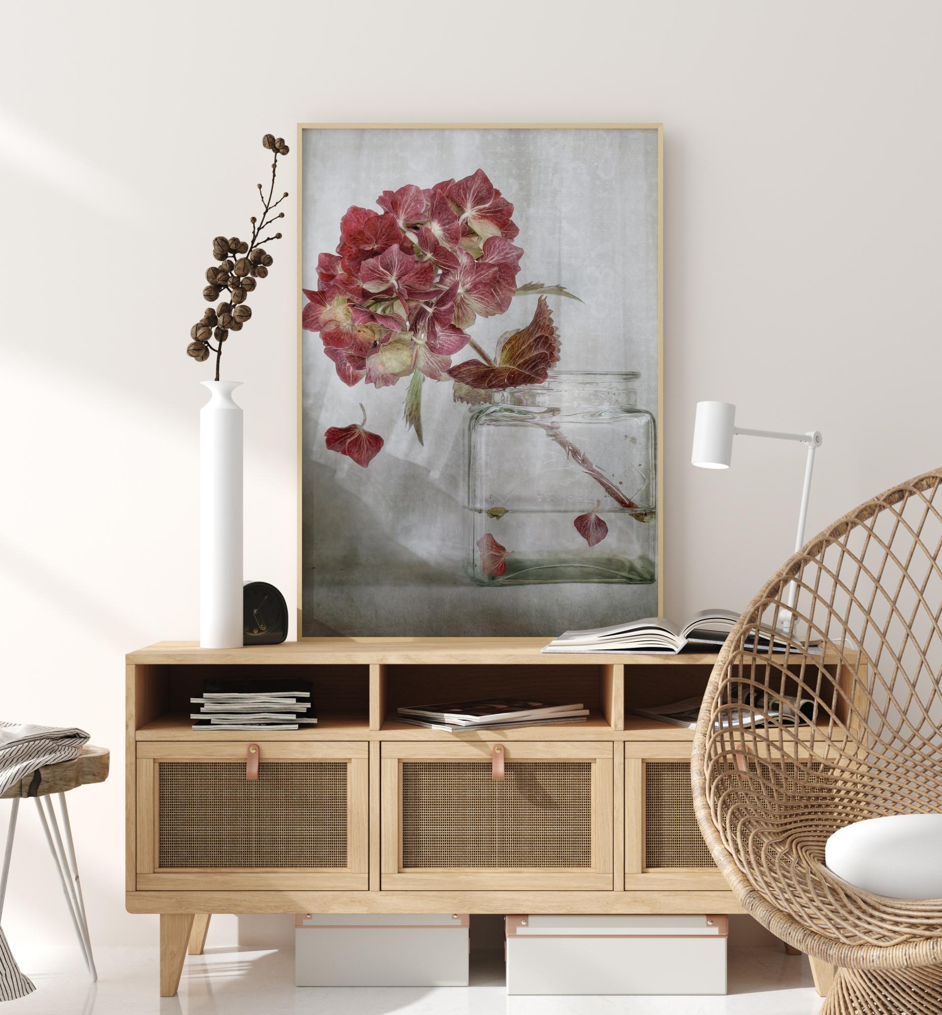 Um belo póster de natureza com um caule de hortênsia em um vaso transparente. Na frente de uma cortina branca florida, cai uma pétala rosa bonita. A cortina tremula com uma brisa suave. Esta imagem quase faz você sentir a brisa.