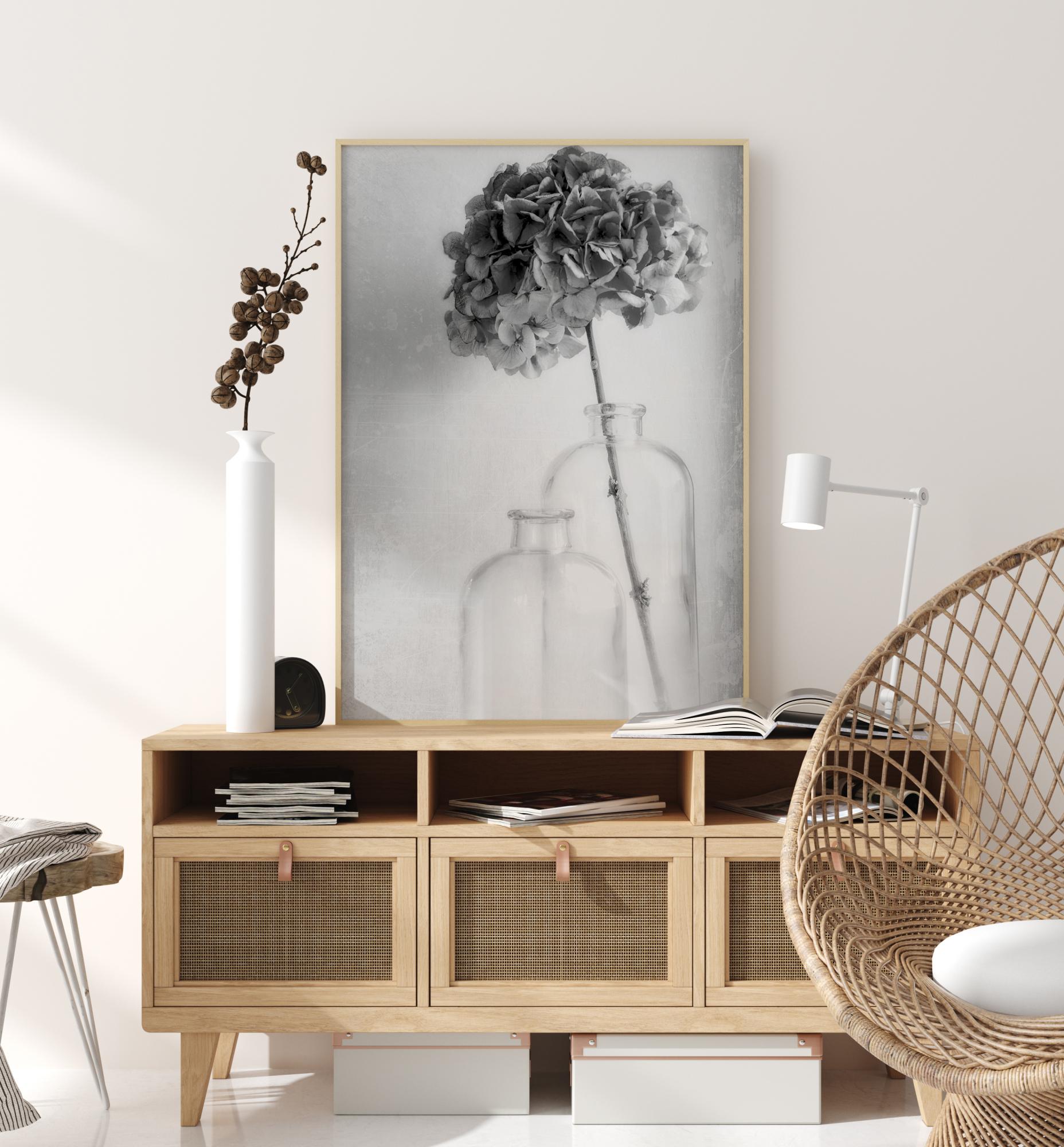 Um belo póster de natureza com um caule de hortênsia em um vaso transparente. Na frente de uma cortina branca florida, cai uma pétala rosa bonita. A cortina tremula com uma brisa suave. Esta imagem quase faz você sentir a brisa.