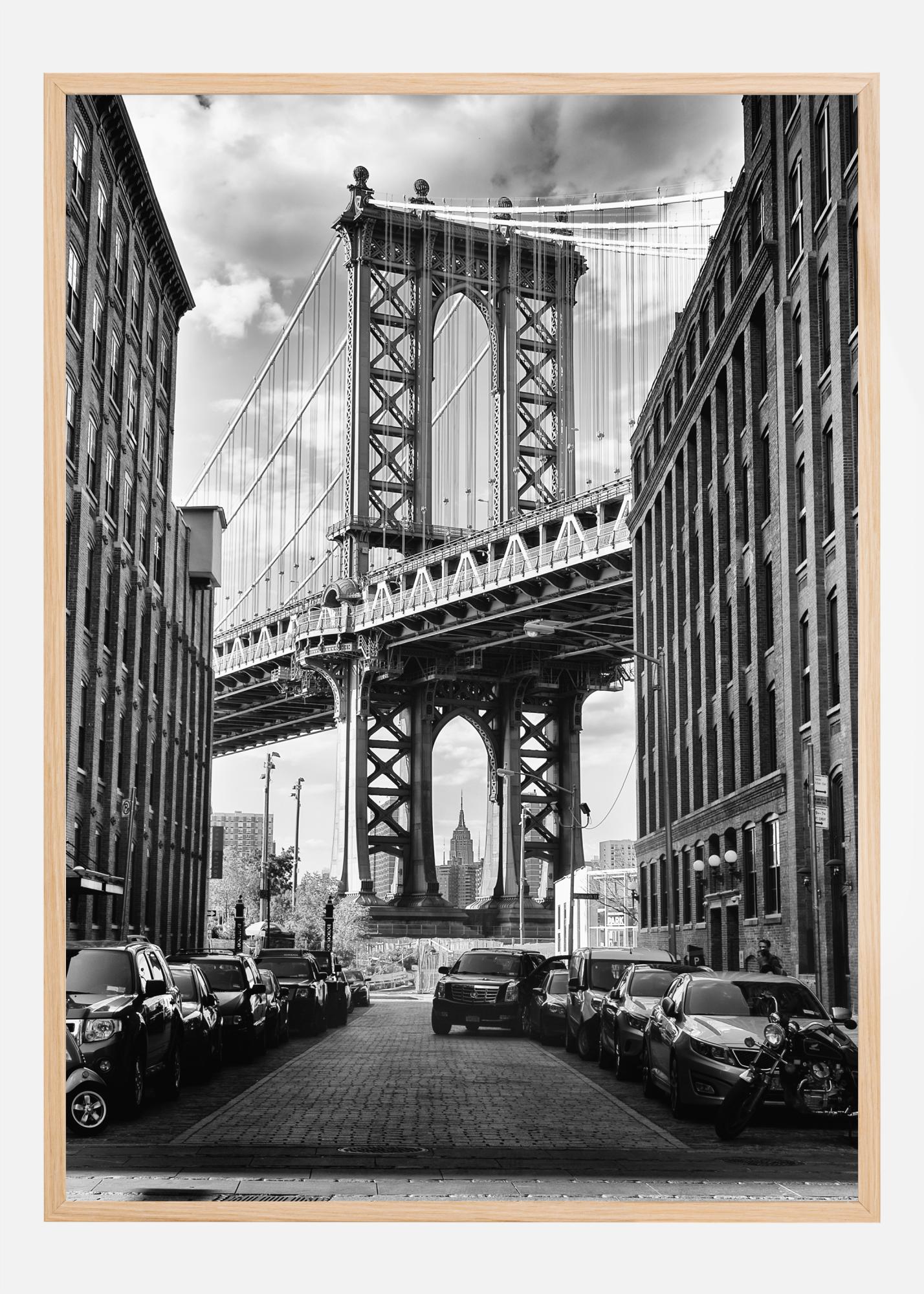 Um póster arquitetônico em preto e branco da Ponte de Manhattan. Sob um céu nublado, fileiras de carros estão estacionados em ambos os lados da rua. Ao longe, ergue-se o magnífico Empire State Building. Uma impressão perfeita para pendurar num ambiente super moderno.