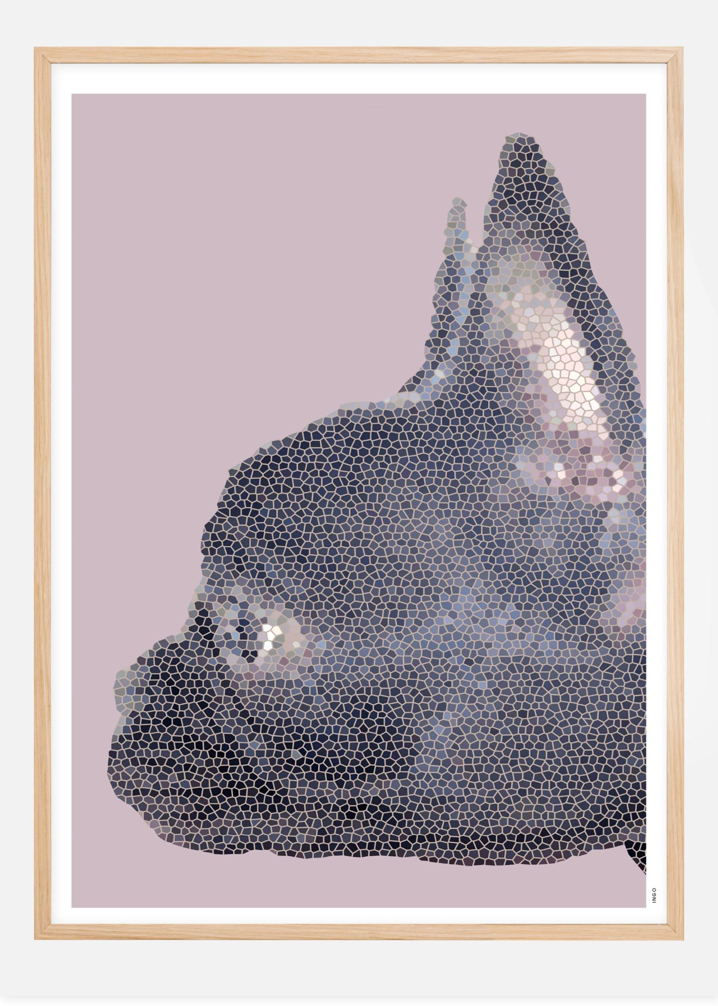 Uma impressão em mosaico em preto e branco com um cão carolino. Num fundo rosa, a luz natural é refletida na orelha e no olho do cão. Com a sua poderosa linha da mandíbula e suas orelhas pontiagudas, o cão olha para a esquerda da impressão como se estivesse olhando para alguém. Um belo póster que é adequado para amantes de animais.