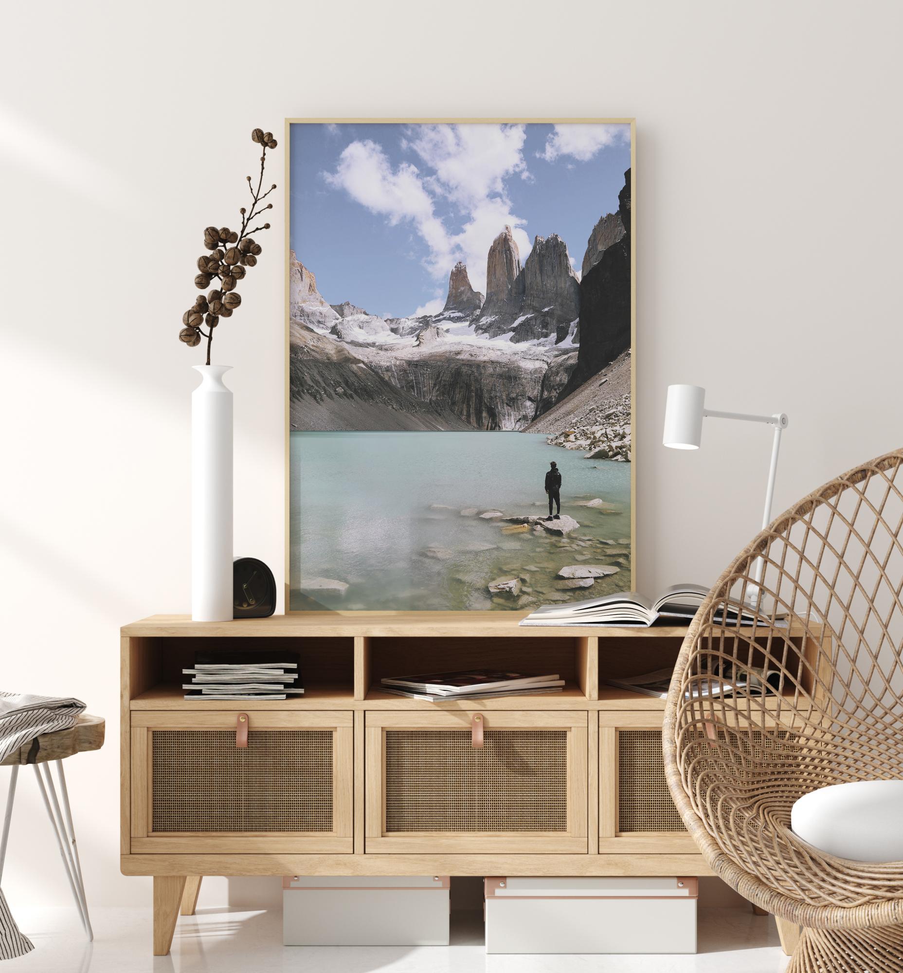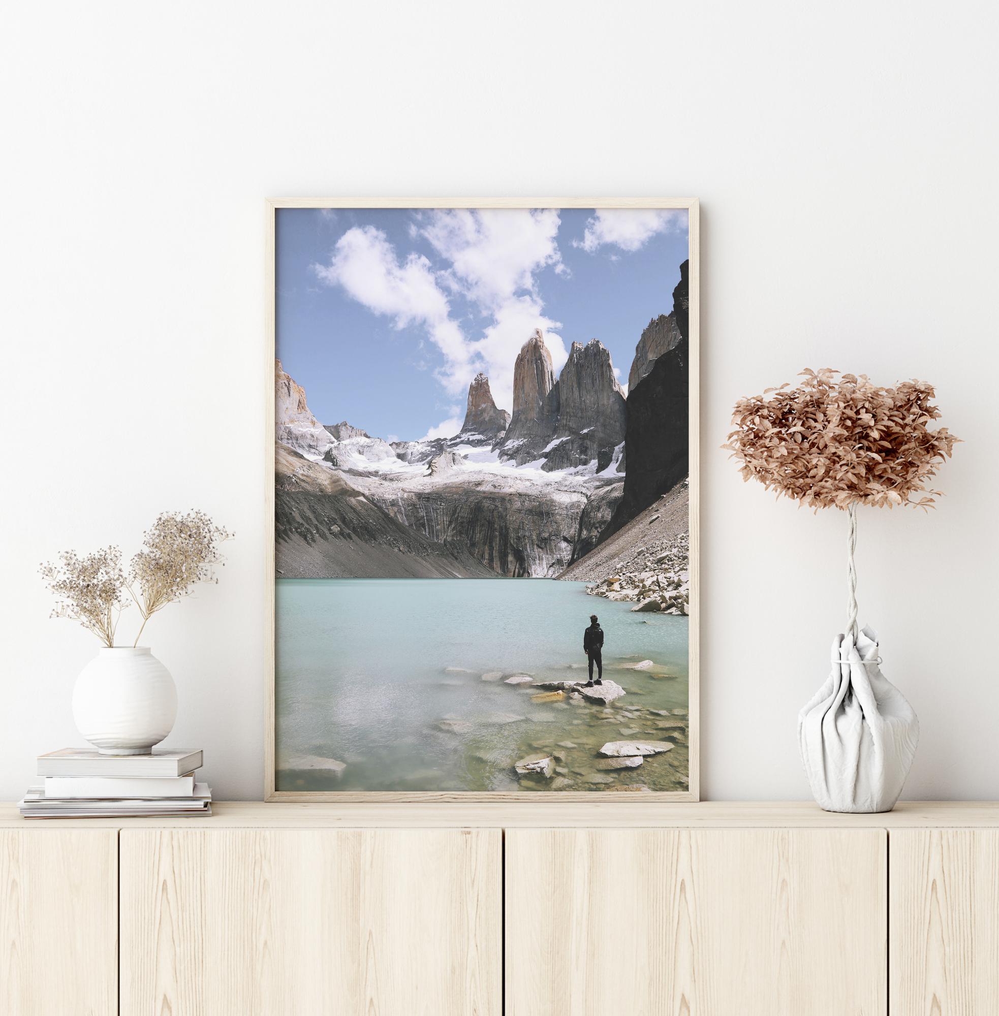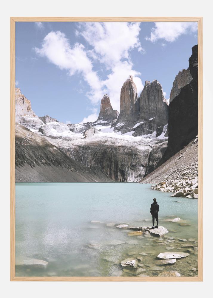 Um póster de natureza com uma figura solitária observando o ambiente deslumbrante. Em pé em uma pedra à beira do lago, as impressionantes montanhas cobertas de neve cercam um lago de cor turquesa. Você quase pode sentir o ar elegante desta imagem mágica.