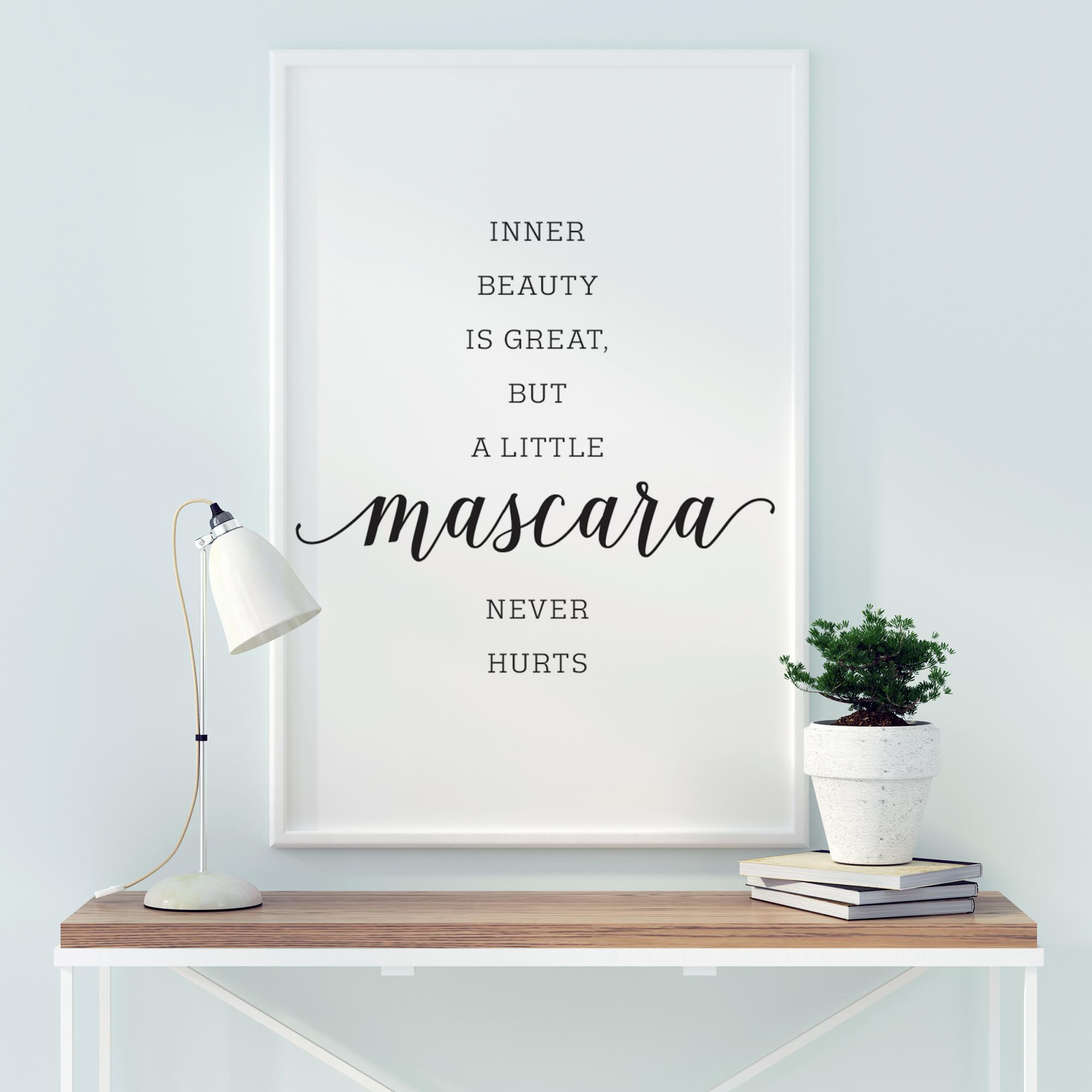 Um póster motivador que transmite uma mensagem para todos que amam se sentir bem. A beleza interior é boa, mas um pouco de rímel nunca faz mal. Uma mensagem para seguir para aquele visual extra especial. Uma bela impressão para pendurar ao lado da sua penteadeira.