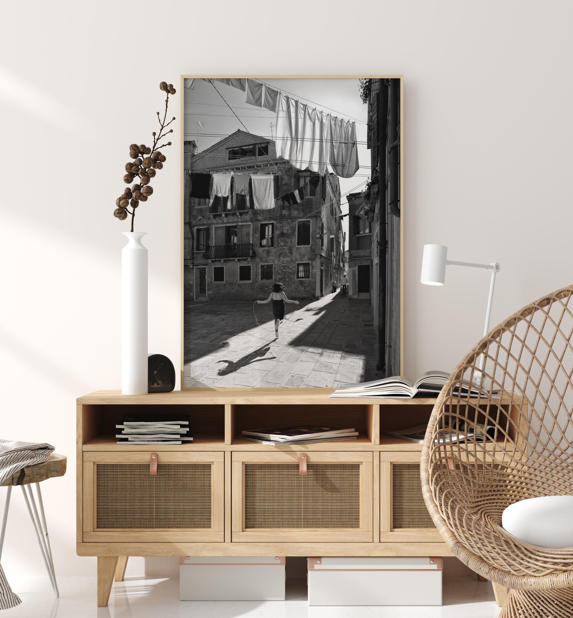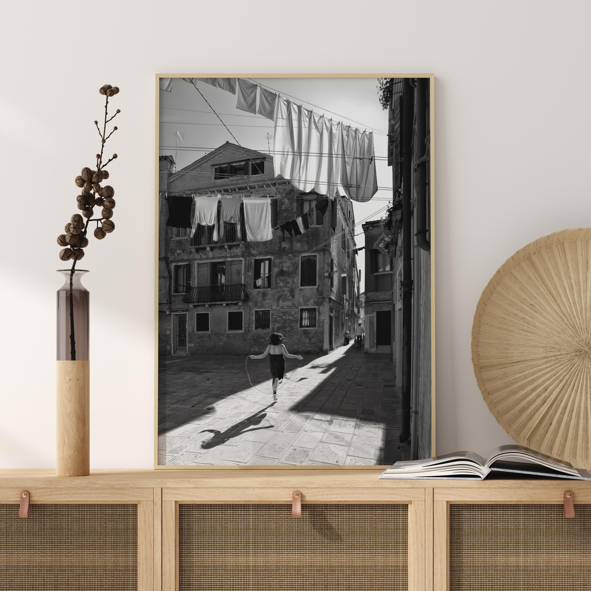 Um cartaz encantador com uma jovem garota pulando corda entre as casas e a roupa lavada. Um raio de sol brilhante a atinge e lança sua sombra atrás dela. Dê à sua casa uma sensação de admiração inocente com a ajuda desta imagem.