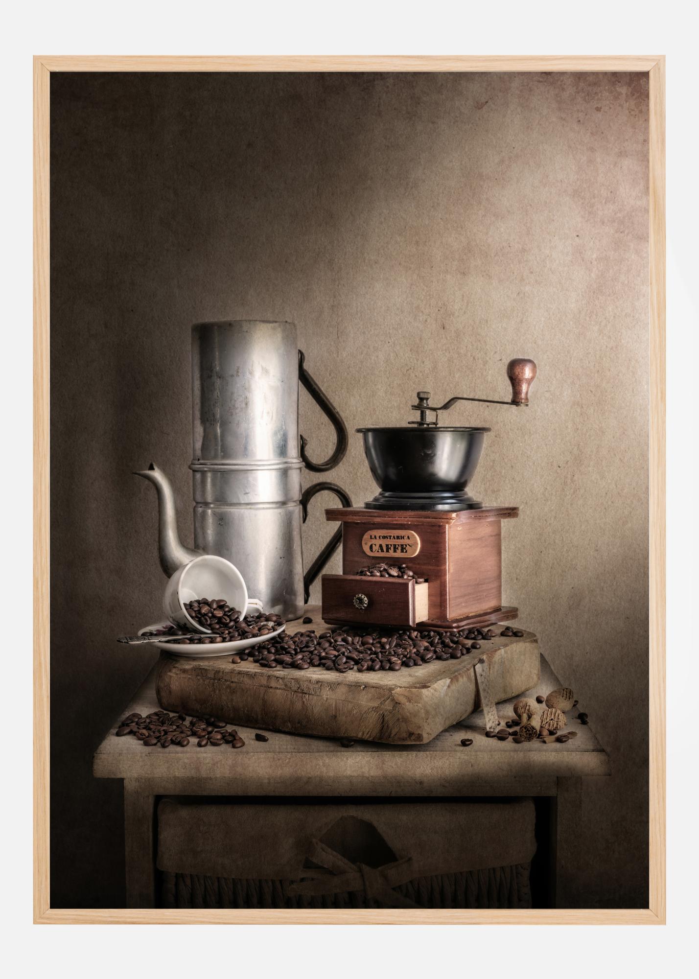 Uma impressão com tema de café com um moedor de café, uma cafeteira, grãos de café e uma chávena branca e um prato. Os tons suaves de marrom nesta impressão criam uma imagem relaxante onde quase pode sentir o cheiro dos maravilhosos grãos de café torrados. A imagem perfeita para pendurar na sua cozinha.