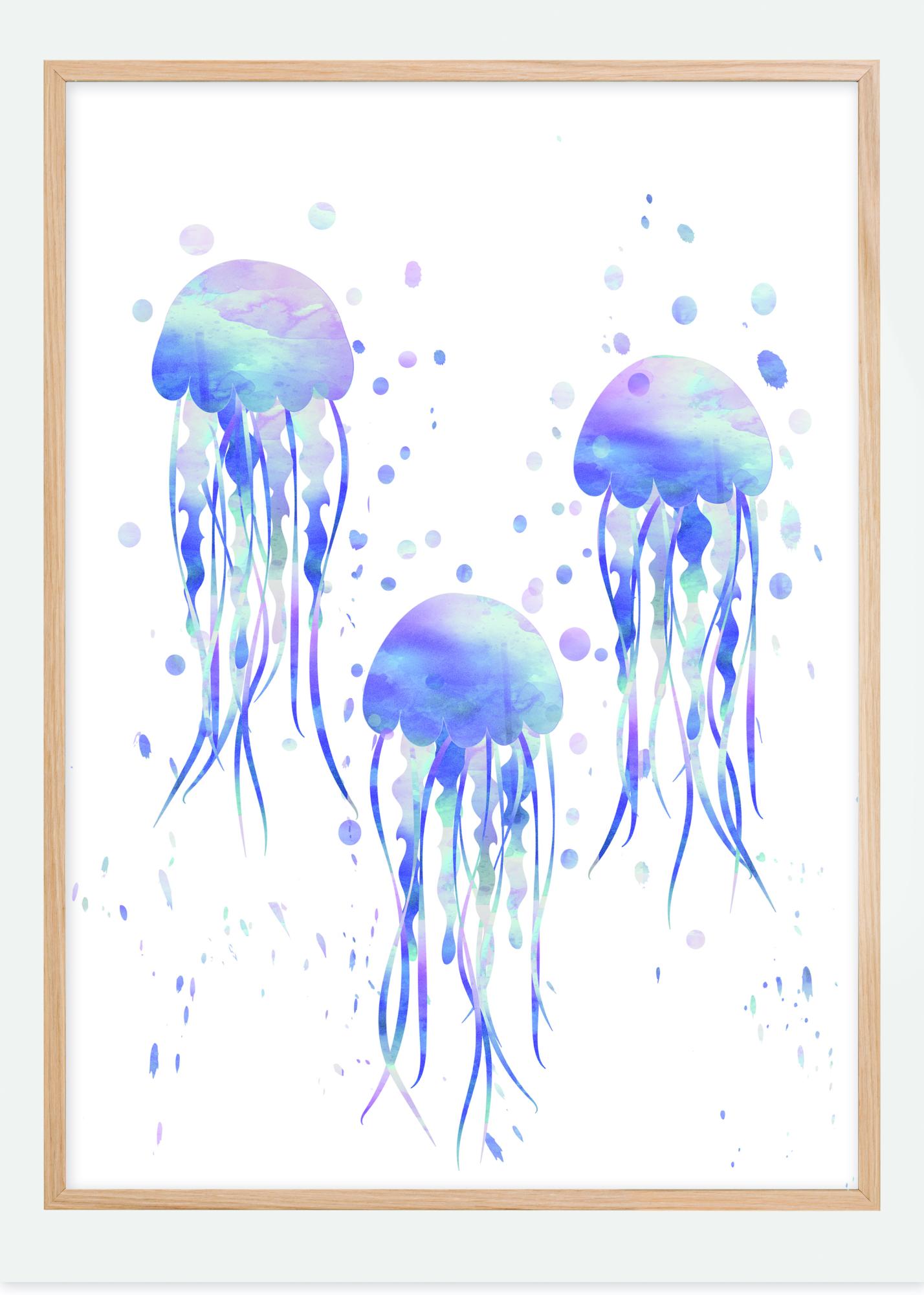 Uma imagem colorida e divertida de duas águas-vivas coloridas num fundo branco. As águas-vivas estão representadas no centro e exibem uma variedade de cores com pontos coloridos ao redor delas. Uma imagem divertida para pendurar numa parede branca ou em um quarto infantil.