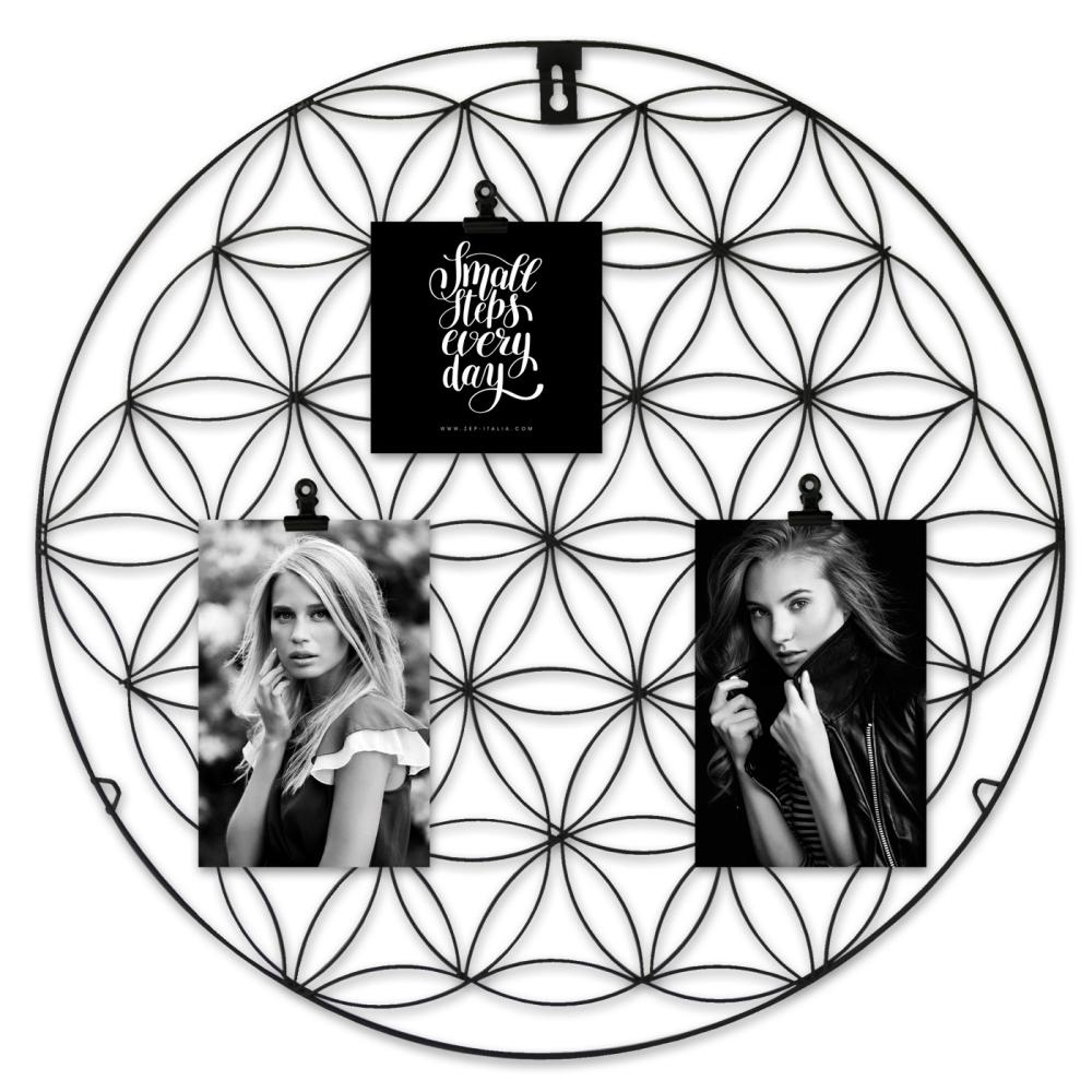 Esta é uma moldura redonda elegante em metal preto. A moldura do colagem mede 50 cm Ø e as imagens são fixadas com grampos num fundo com padrão decorativo. Como você fixa as imagens com grampos, pode escolher fixar imagens de diferentes tamanhos para criar uma sensação elegante e um pouco dinâmica. Esta moldura redonda de colagem em metal pode ser colocada com estilo em casa para chamar a atenção, ou pode ser dada como um belo presente para alguém!