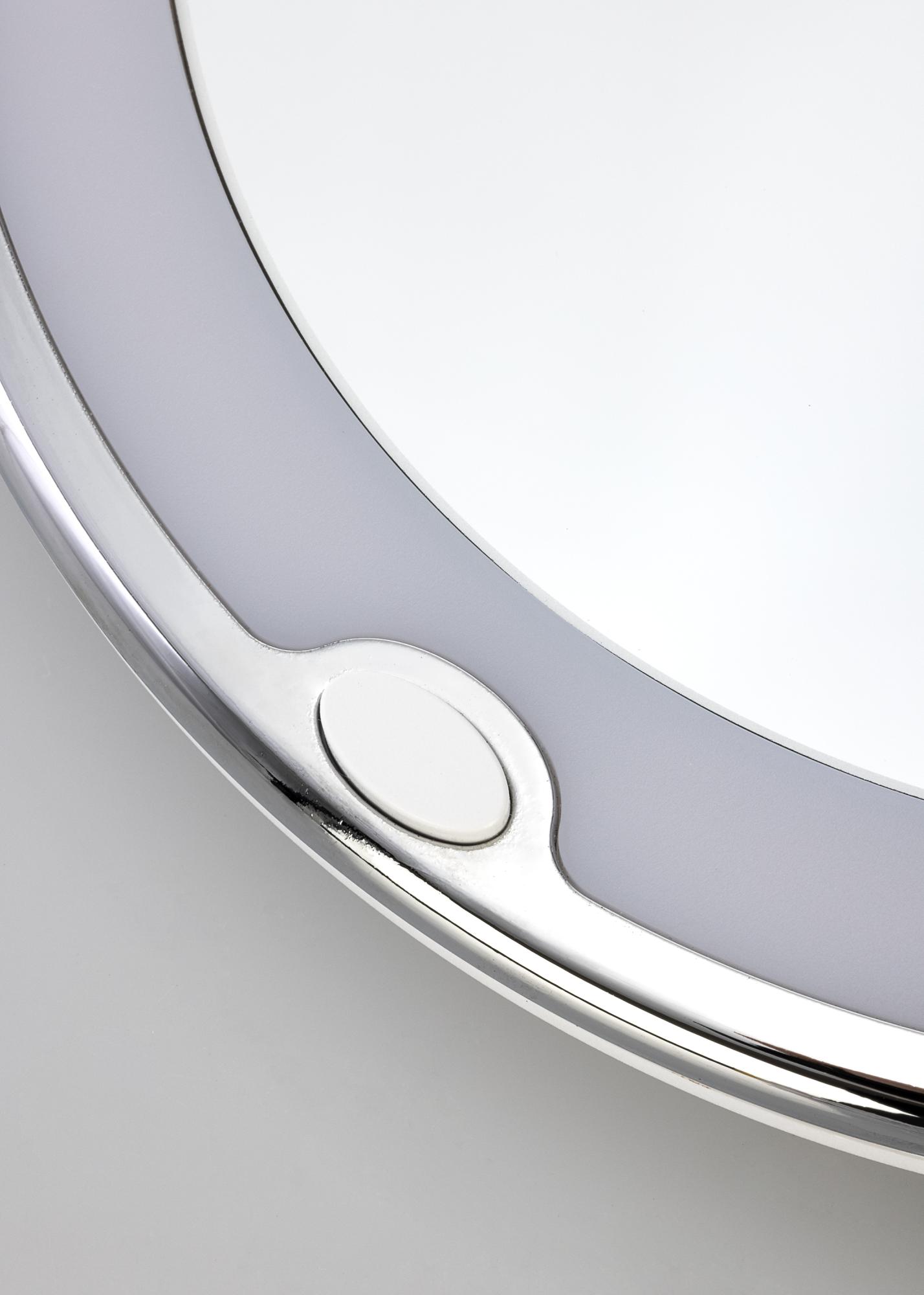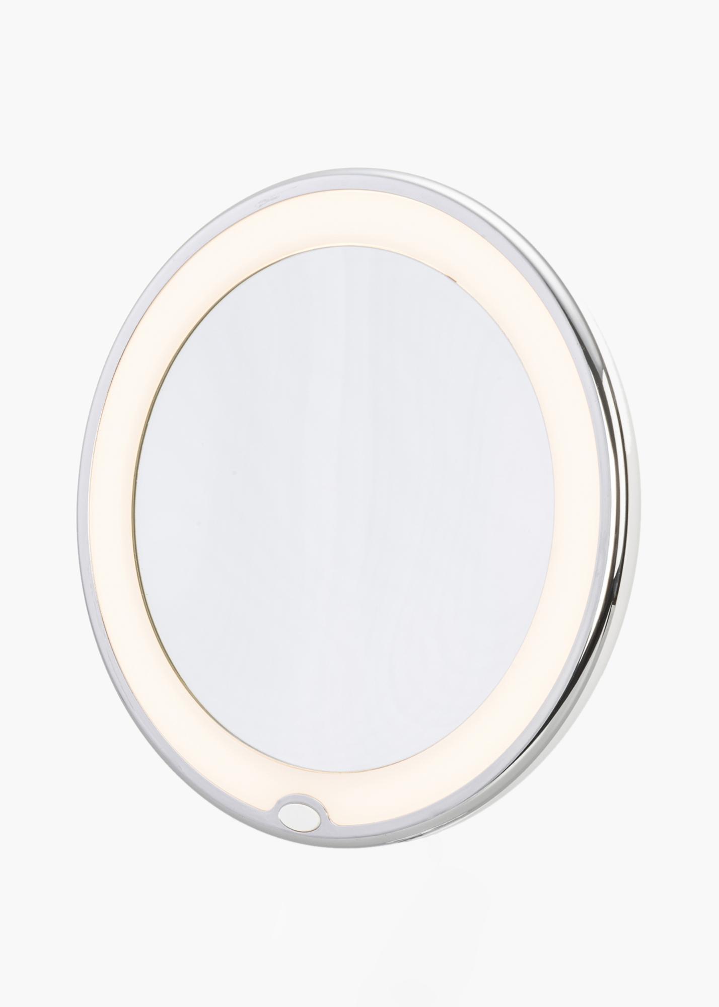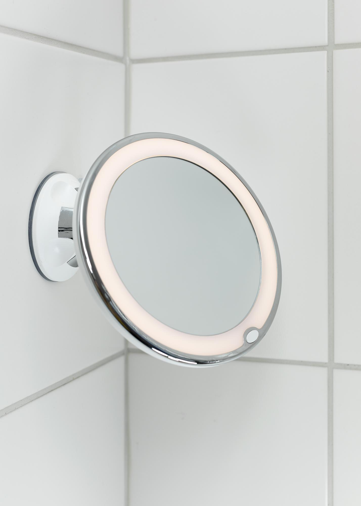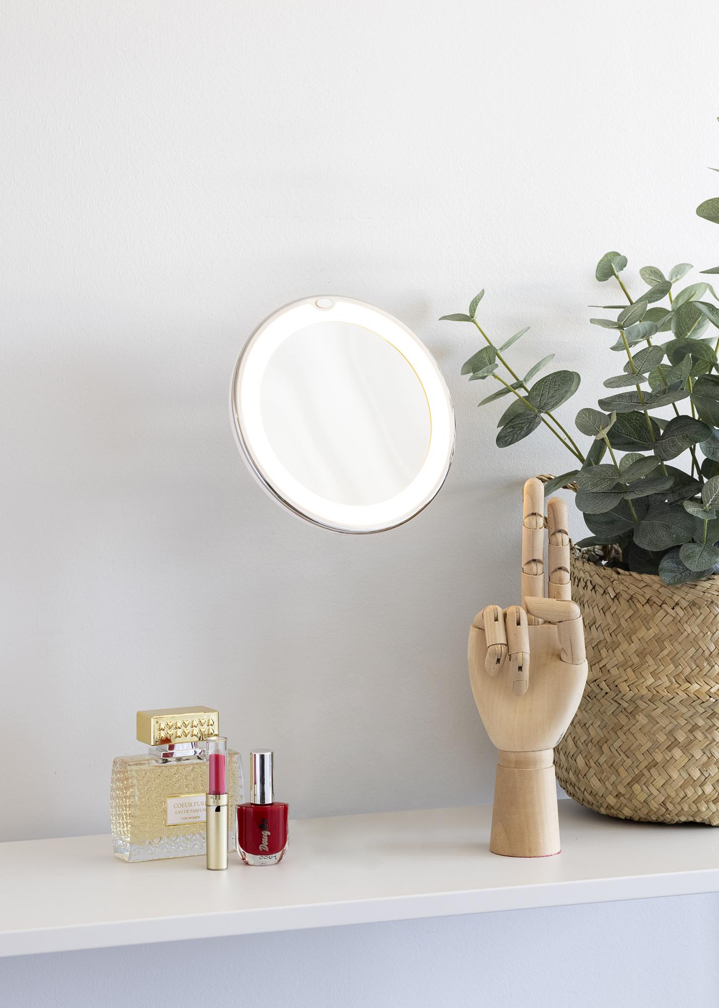 Este é um clássico espelho de casa de banho da KAILA num design elegante. O espelho elegante possui iluminação LED integrada que emoldura o vidro do espelho. O espelho da casa de banho tem 17 cm de diâmetro e possui um vidro de espelho ampliador com zoom de 5x. Em outras palavras, este espelho é excelente para obter uma imagem nítida em close do seu rosto! O espelho é decorativo como um detalhe de decoração, mas o seu design elegante também permite que o espelho seja facilmente guardado quando não estiver em uso. O espelho é fixado na parede, azulejo ou mesa com a ventosa correspondente. A ventosa é travável e garante que o espelho fique estável. Entregue desmontado.