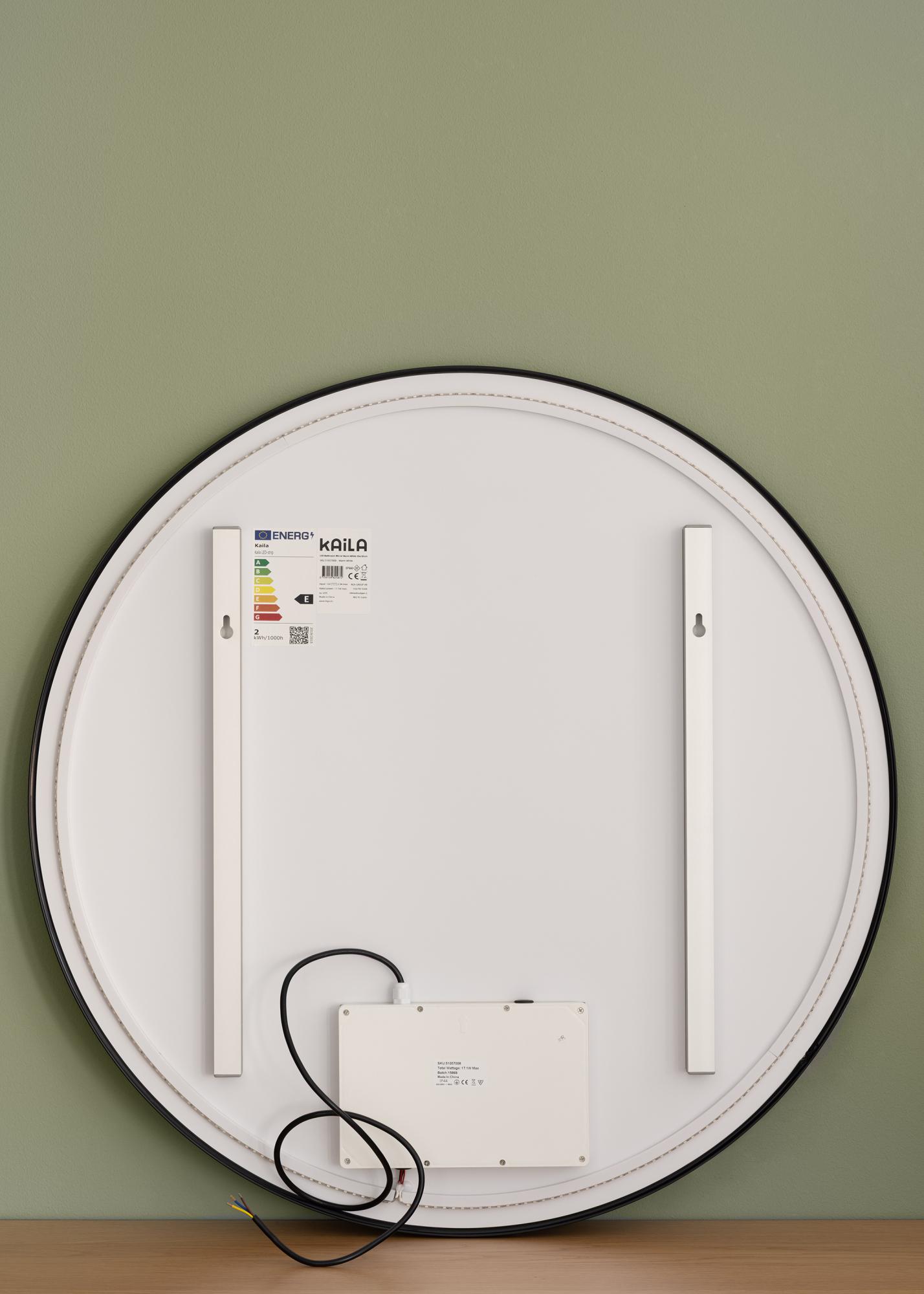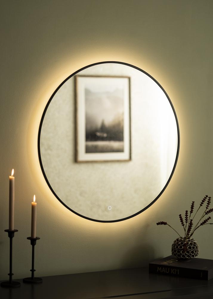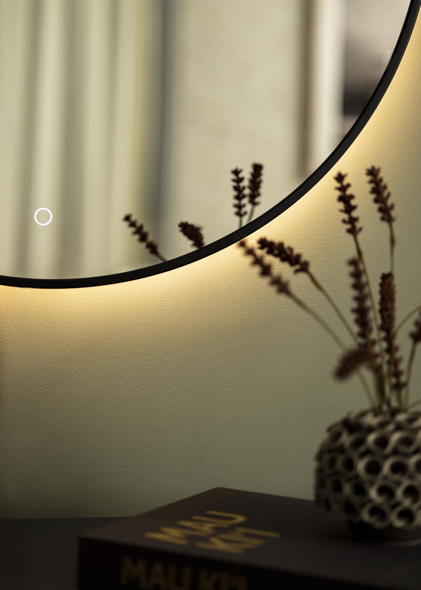 Este é um espelho elegante com iluminação LED, que é tão bonito no corredor quanto na casa de banho. O espelho tem uma forma redonda clássica e uma moldura de metal em uma sofisticada cor preta. A iluminação LED integrada do espelho em 3000K pode ser ajustada de 10% a 100% de brilho. Isso permite que ajuste facilmente a iluminação para o brilho que preferir e altere-o se suas necessidades mudarem. Para ajustar o brilho, mantenha pressionado o botão tátil na parte inferior da superfície do espelho por alguns segundos. A iluminação LED está localizada na parte de trás do espelho, o que confere uma aparência mais suave à luz.